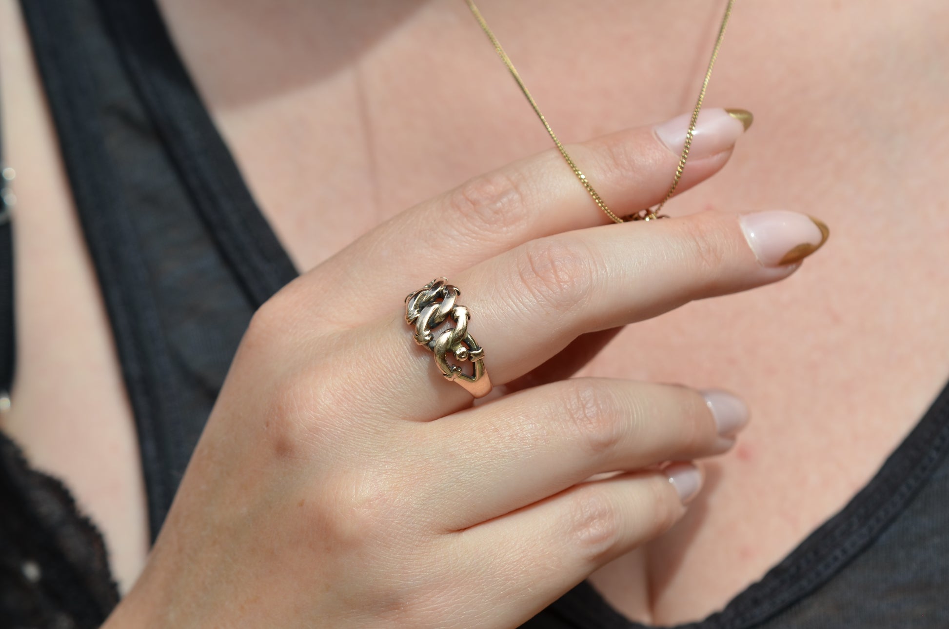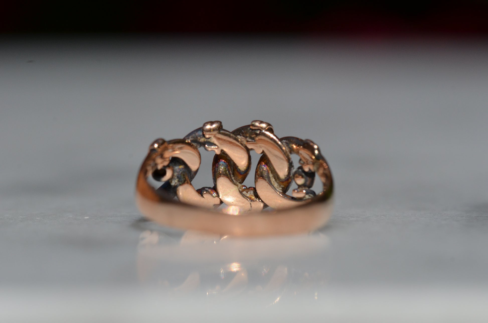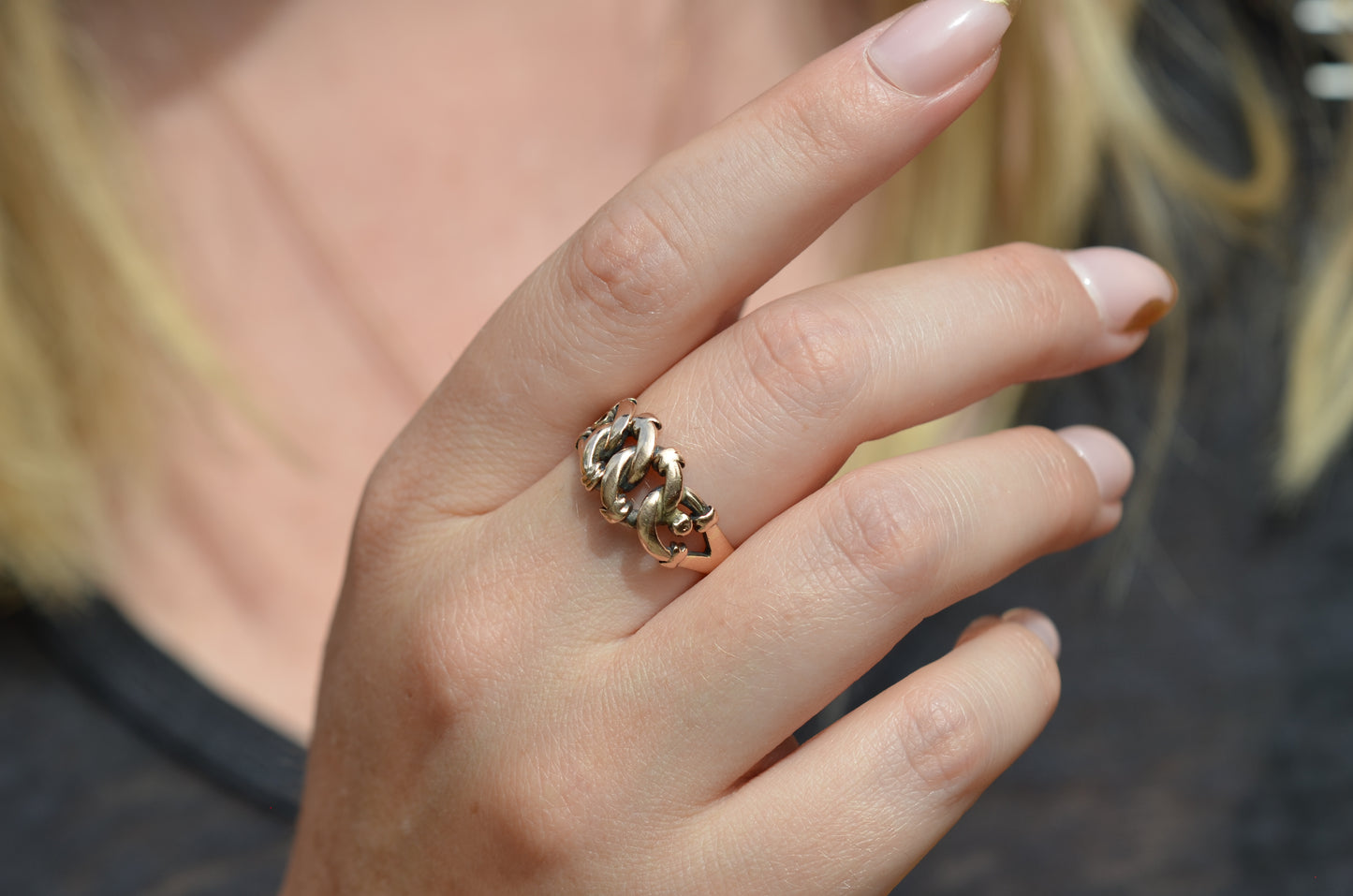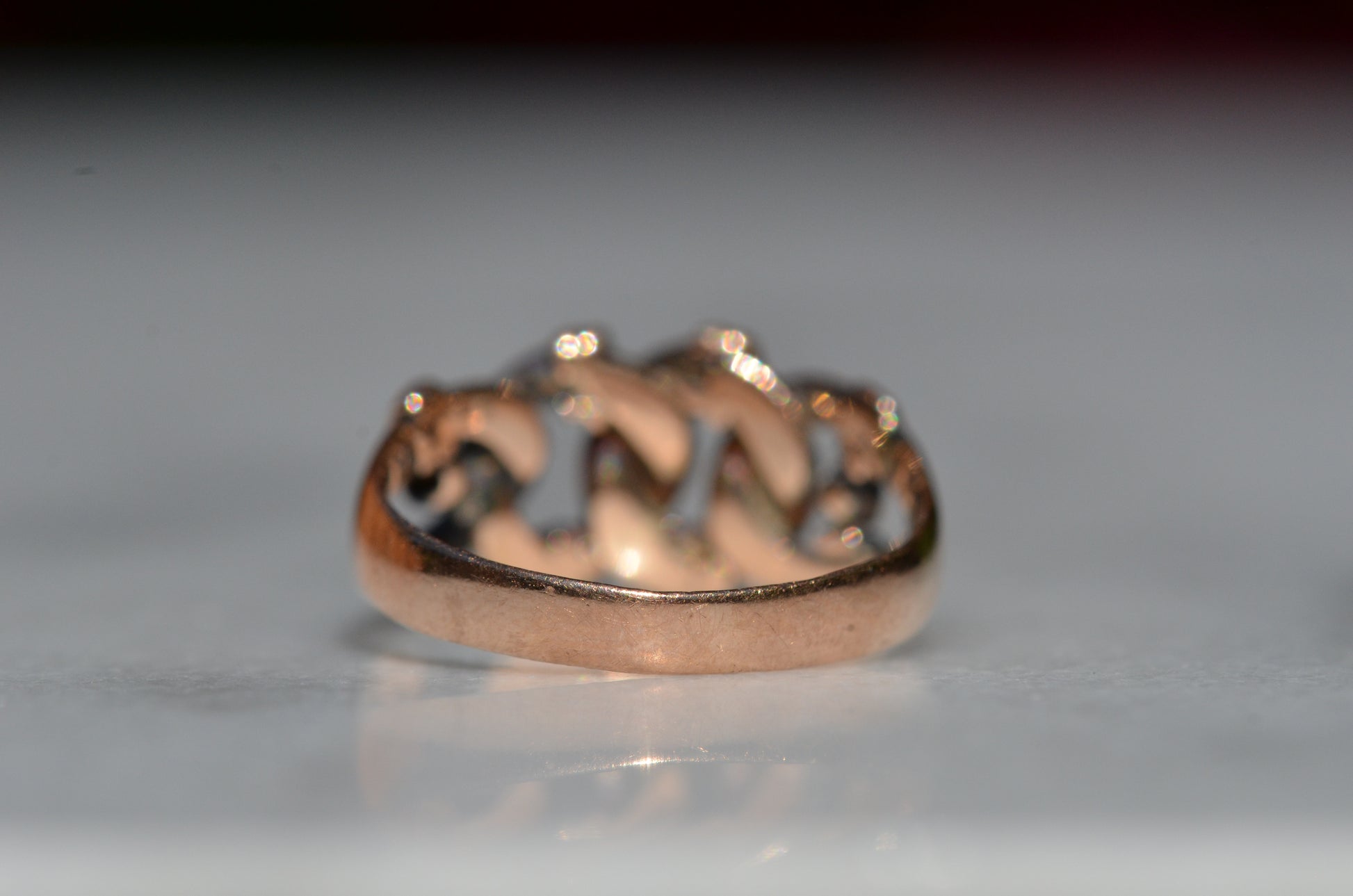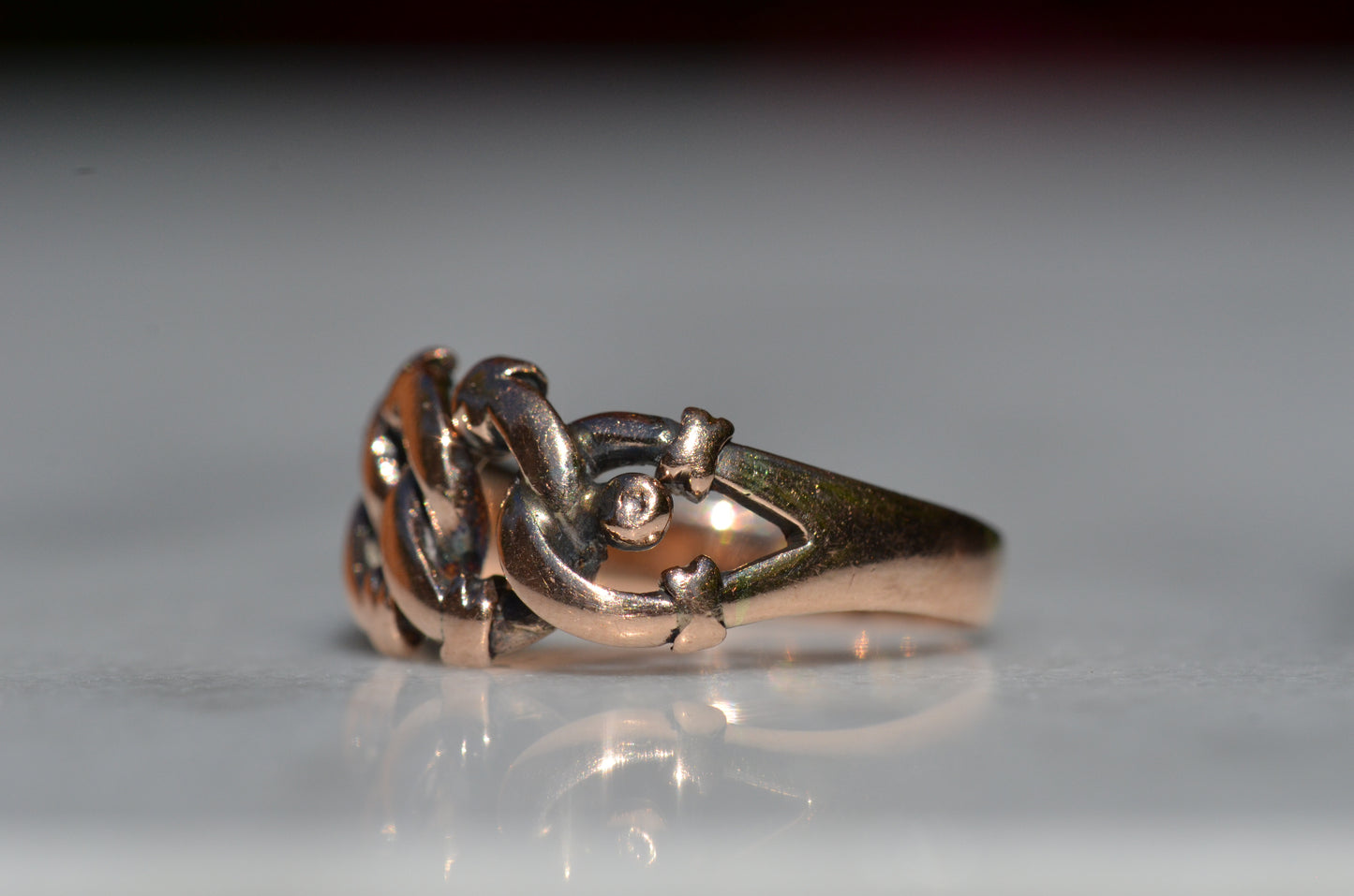 A lovely late Victorian style crafted in the Edwardian period this unique ring takes its cues from woven-look keeper rings and intricately entwined lovers' knots. While the appearance here is almost of a chain, it has a nautical feel and maintains the romantic charm of its inspirations.