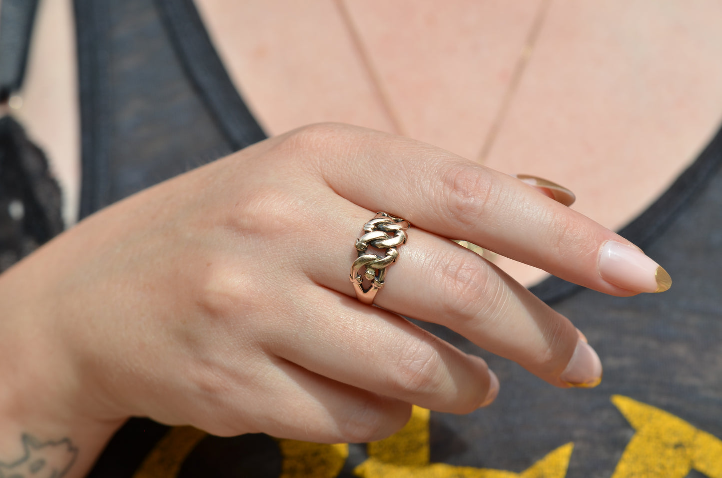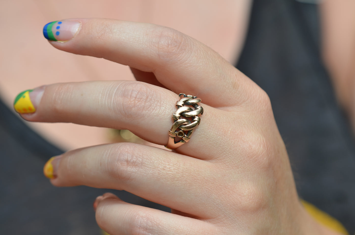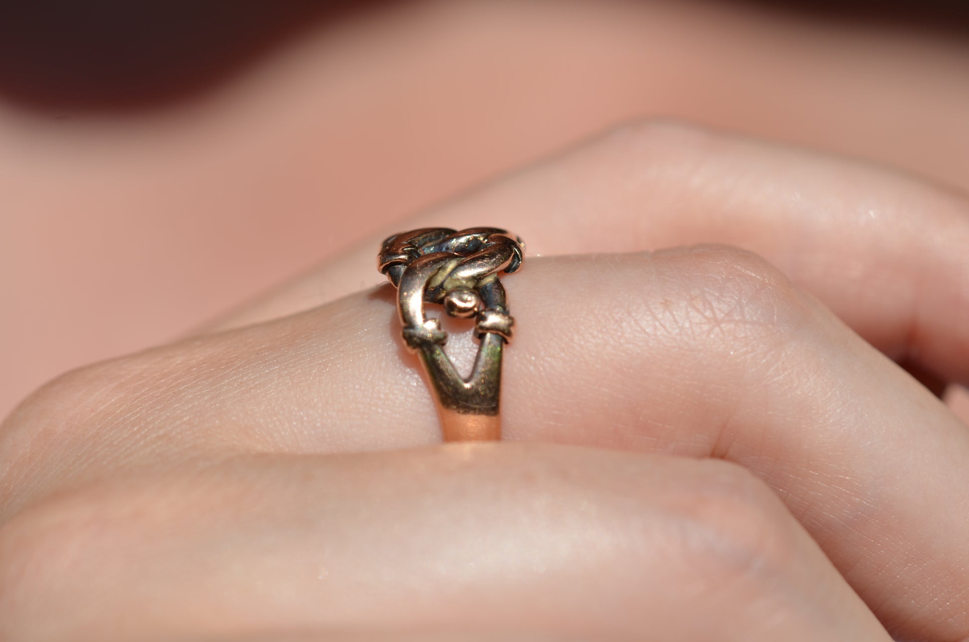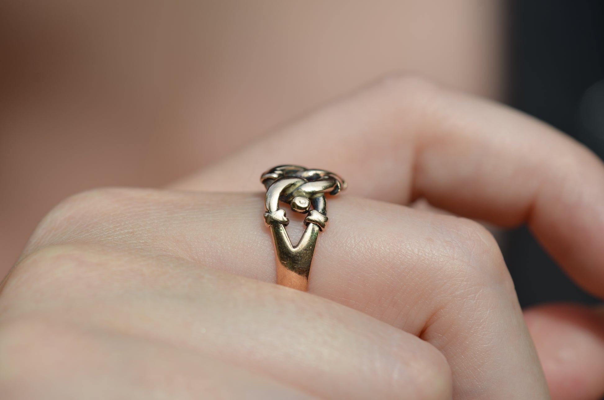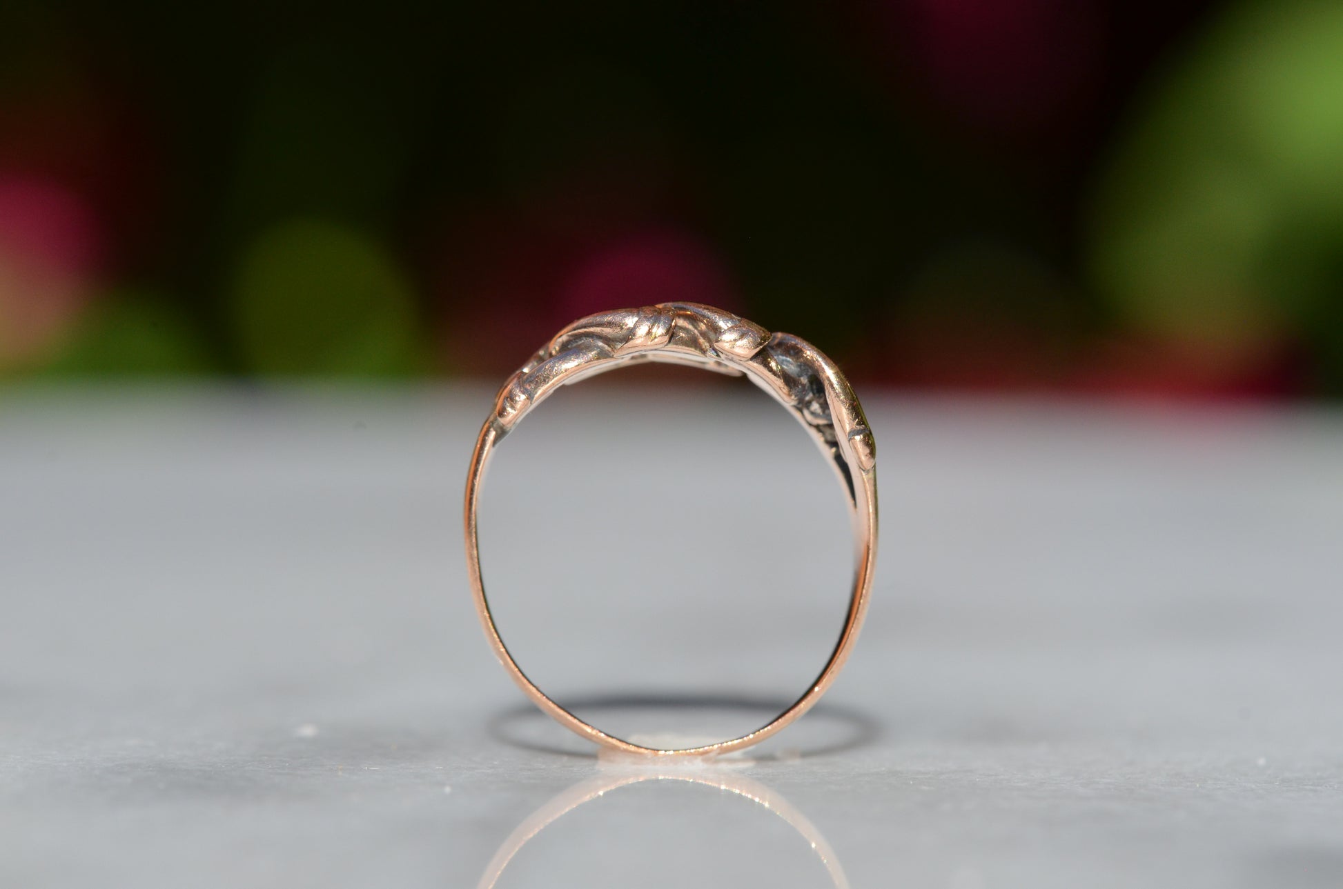 A lovely late Victorian style crafted in the Edwardian period this unique ring takes its cues from woven-look keeper rings and intricately entwined lovers' knots. While the appearance here is almost of a chain, it has a nautical feel and maintains the romantic charm of its inspirations.