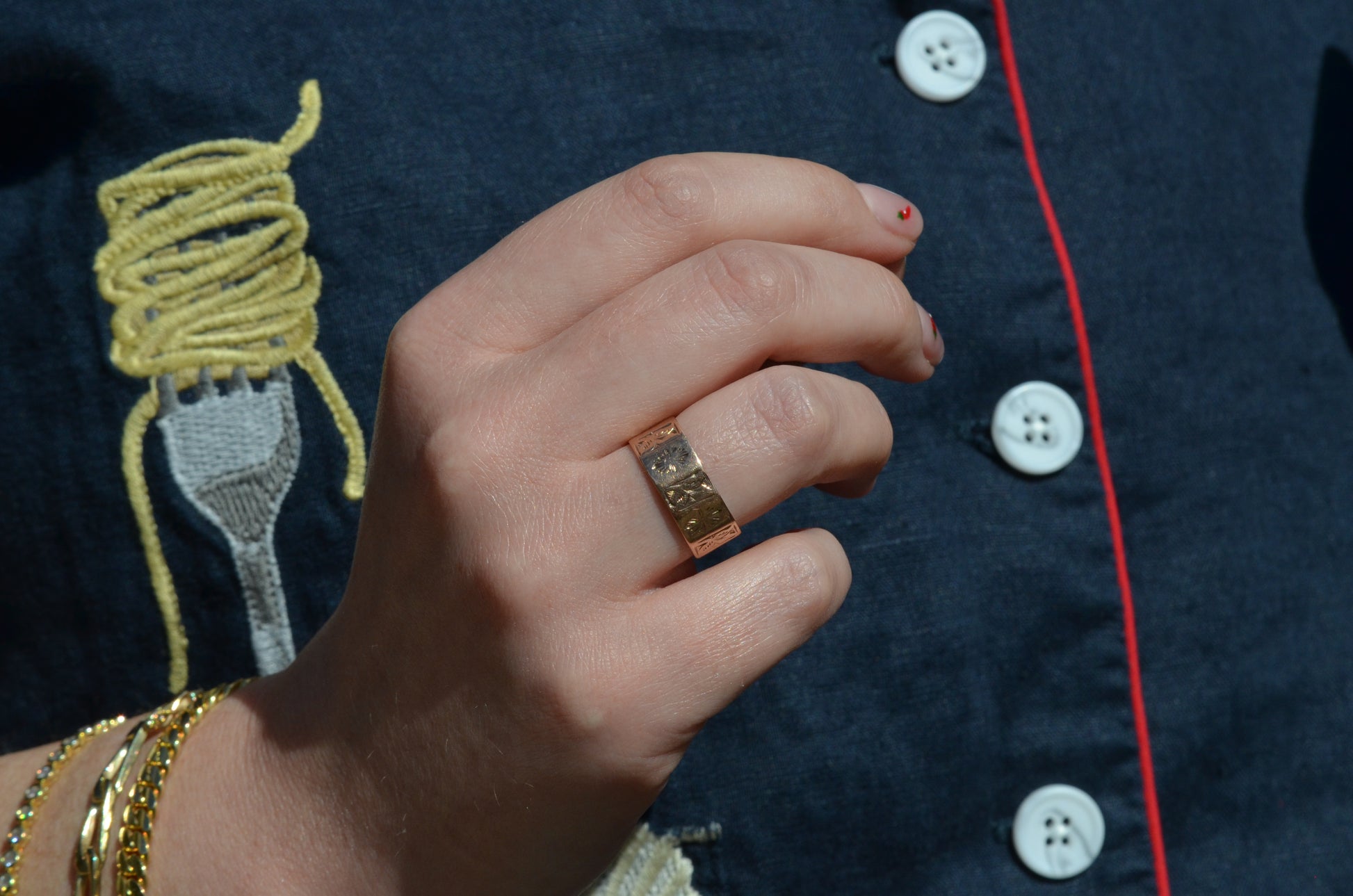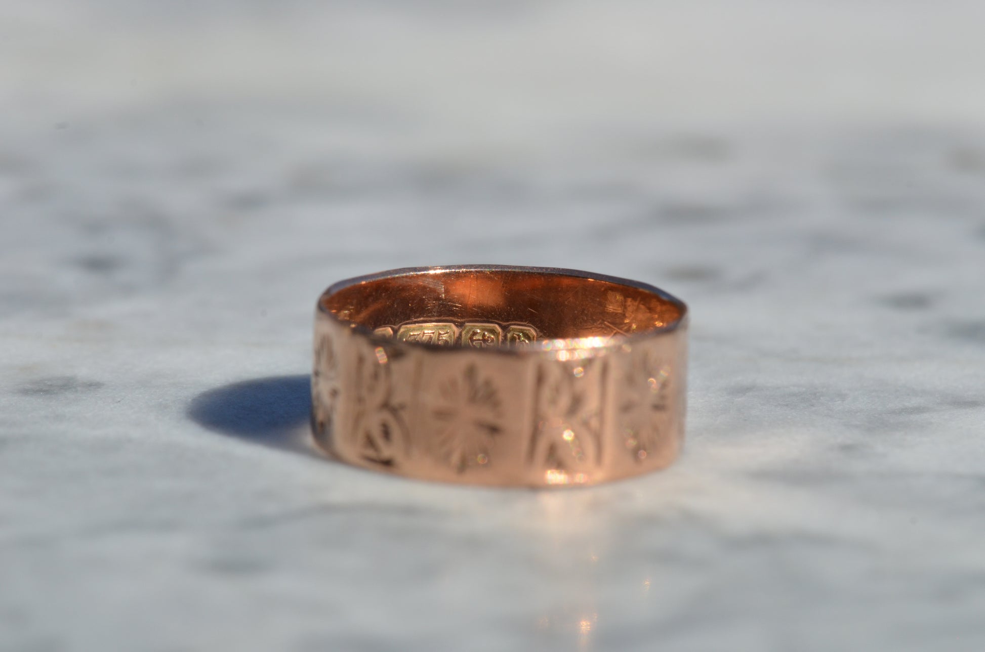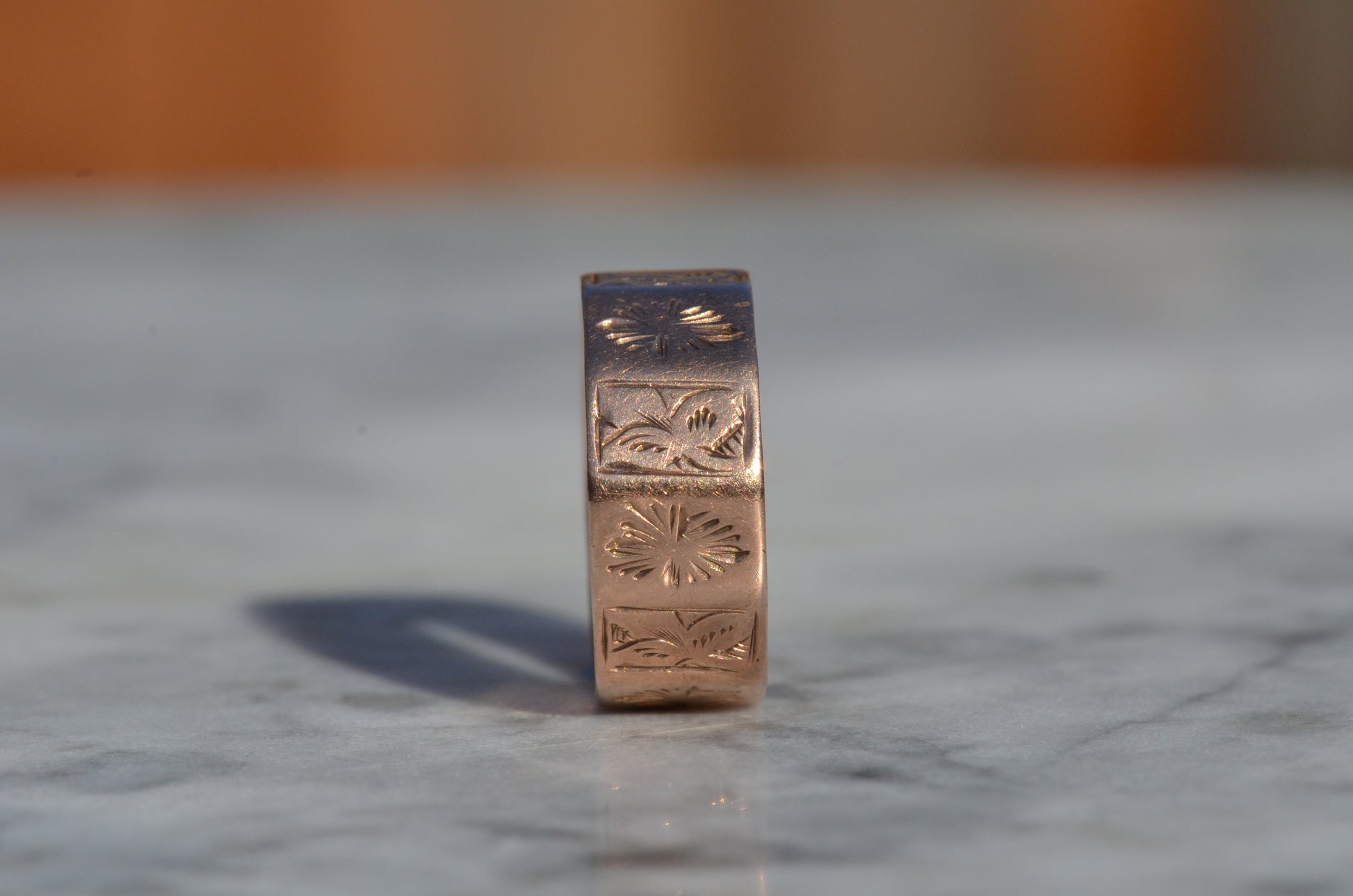 A beautiful band adorned with subtle symbolism, this ring features alternating panels engraved with ivy leaves and bursts of rays. Ivy, an evergreen plant, is understandably associated with everlasting love, devotion, and friendship - feelings that stay true just as the leaves hold their colour. Further, the nature of the plant as it climbs and clings lends itself to symbolism of tight, unbreakable bonds.