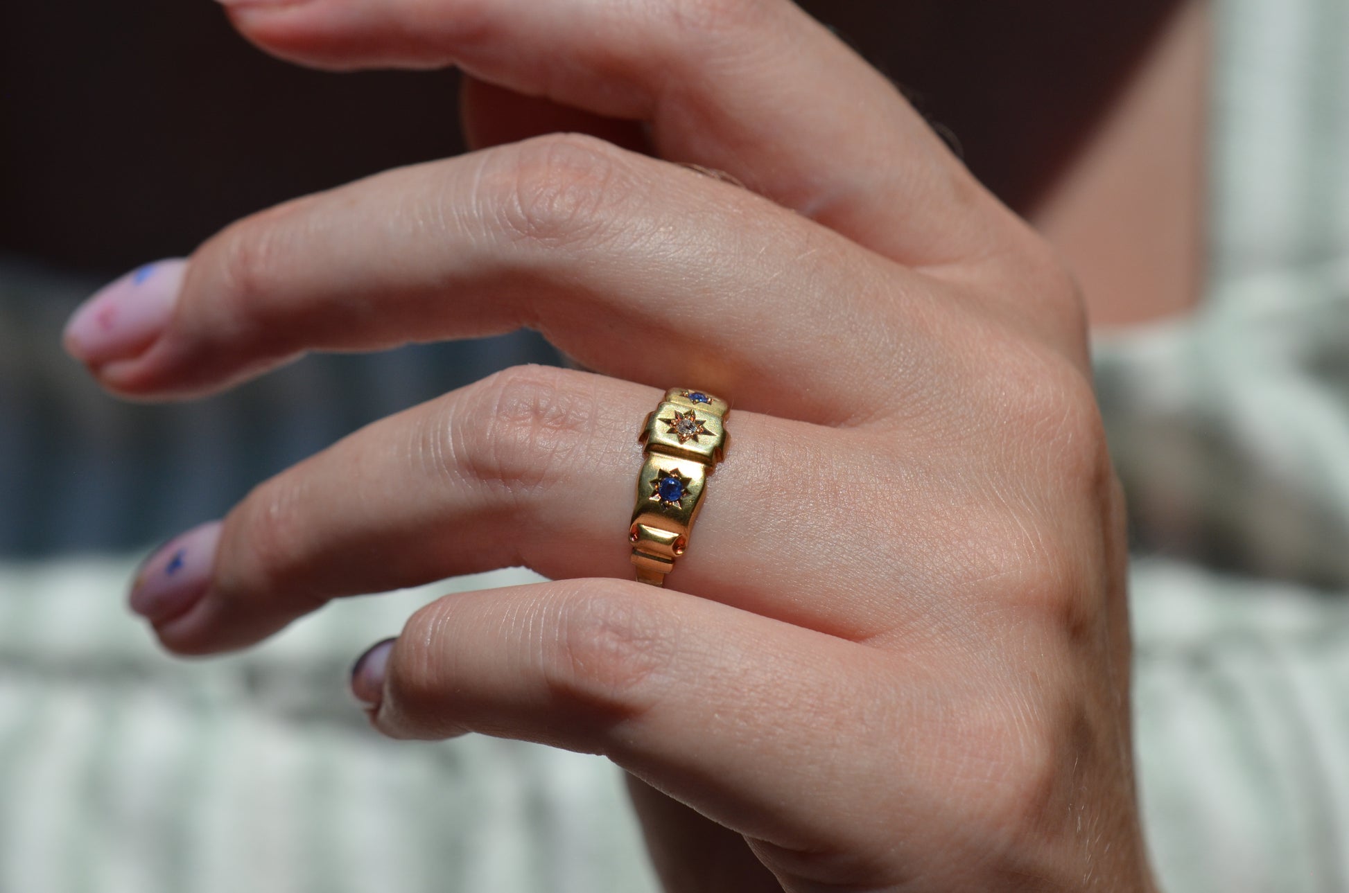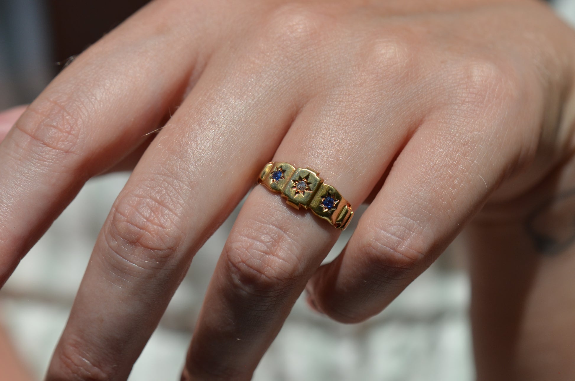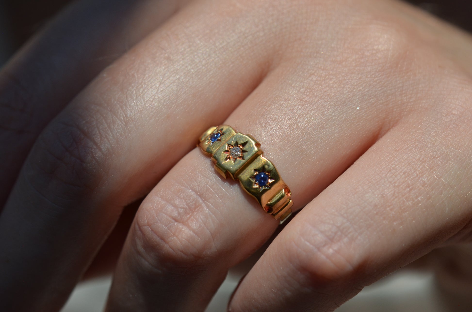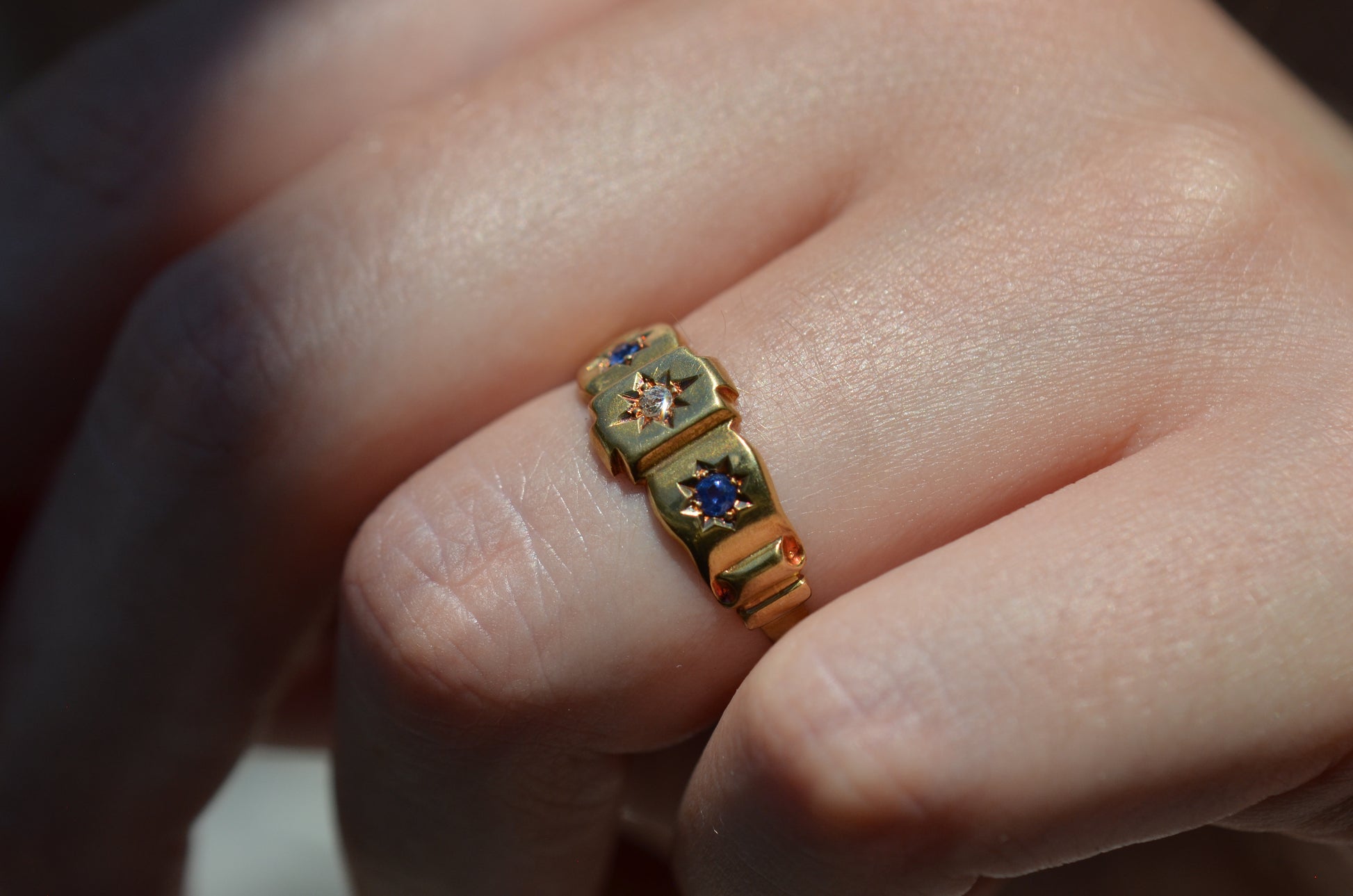 There is something so rich and inviting about the appearance of this Victorian ring: each stone, alternating sapphire and diamond, is set in its very own rectangular panel with scrolling edges curling inwards. Trilogy rings were a favourite of the era, and we love the way they offer broad finger coverage in a low-rise and easy to wear style. While this ring would make a dreamy solo or stacking ring, we also think it would be mightily romantic as an anniversary gift, an alternative engagement or wedding ring, or even a little something old AND blue on a wedding day.