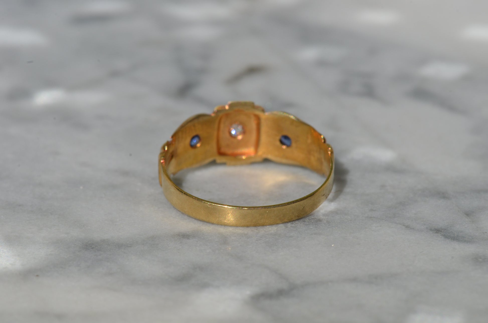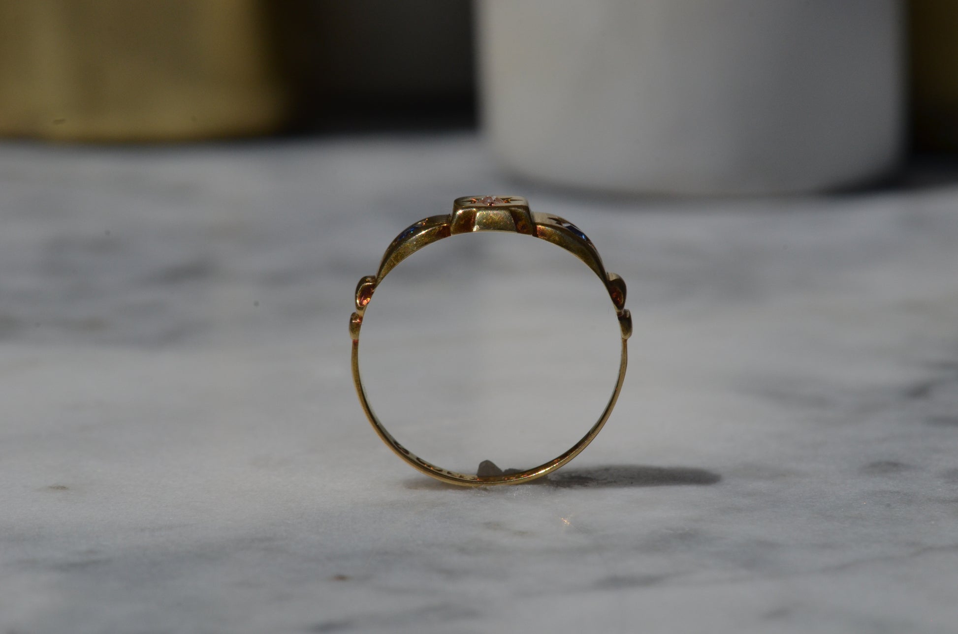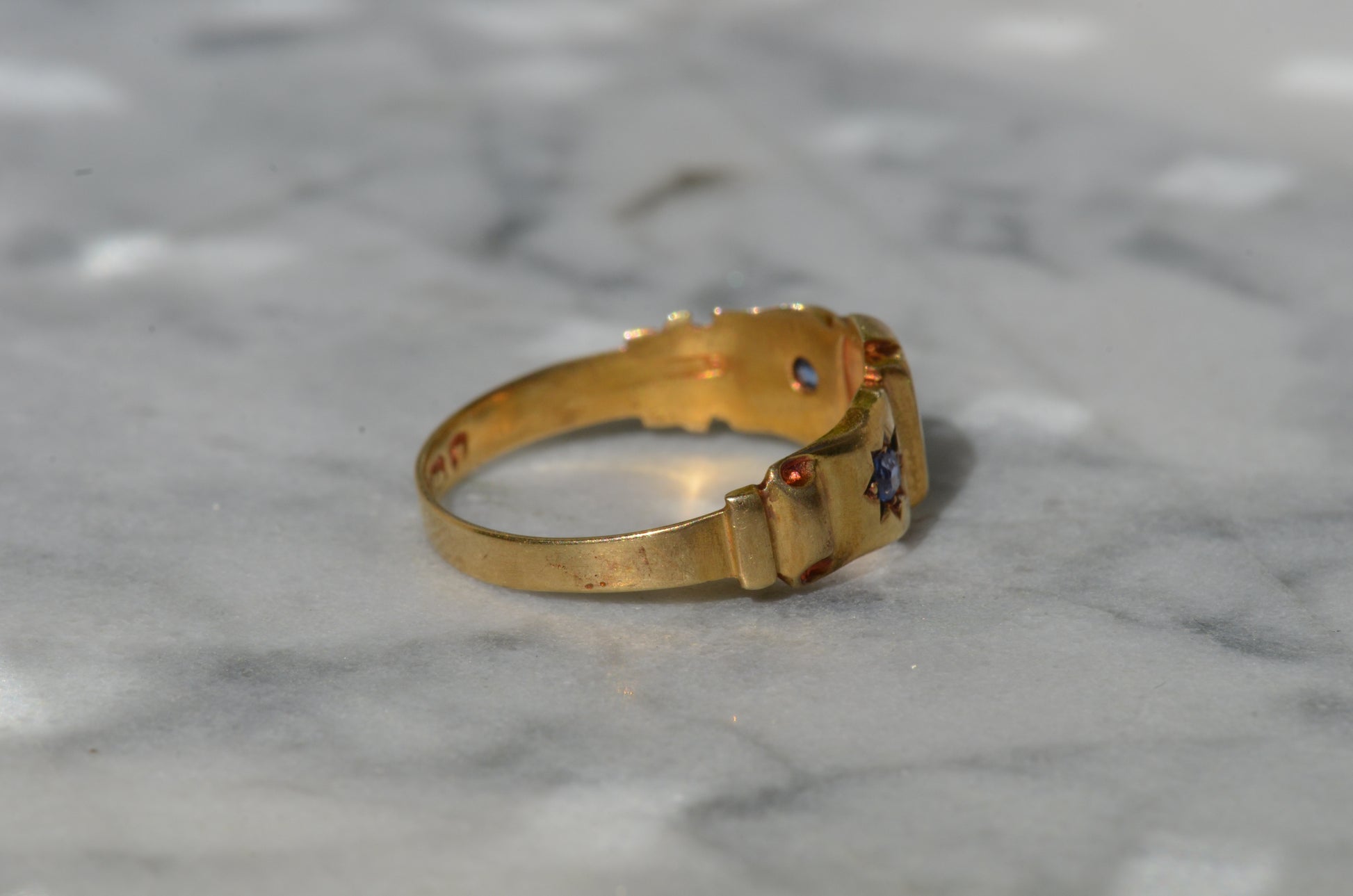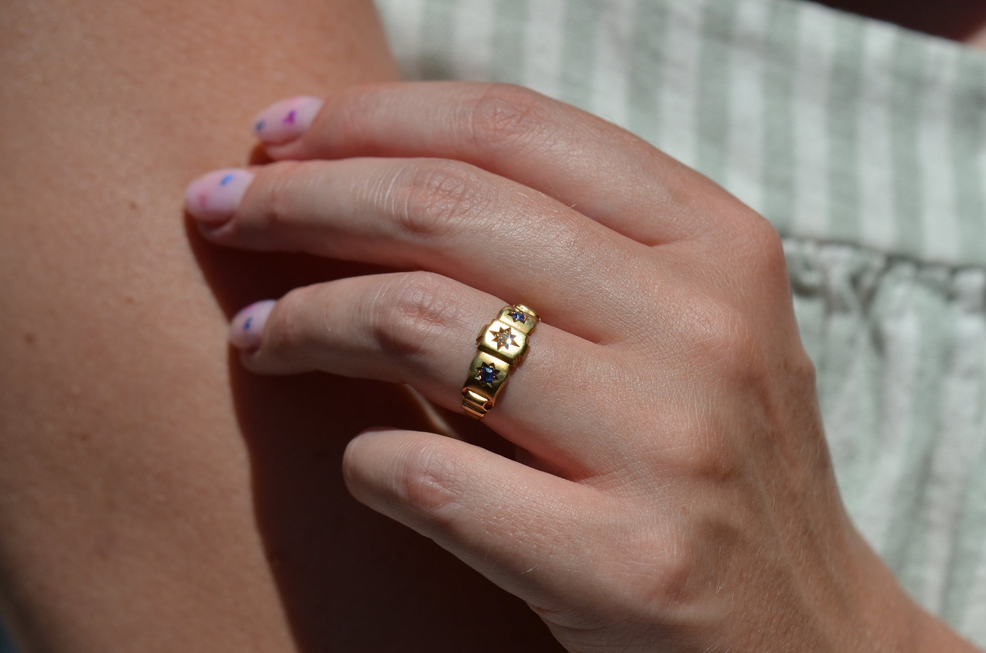 There is something so rich and inviting about the appearance of this Victorian ring: each stone, alternating sapphire and diamond, is set in its very own rectangular panel with scrolling edges curling inwards. Trilogy rings were a favourite of the era, and we love the way they offer broad finger coverage in a low-rise and easy to wear style. While this ring would make a dreamy solo or stacking ring, we also think it would be mightily romantic as an anniversary gift, an alternative engagement or wedding ring, or even a little something old AND blue on a wedding day.