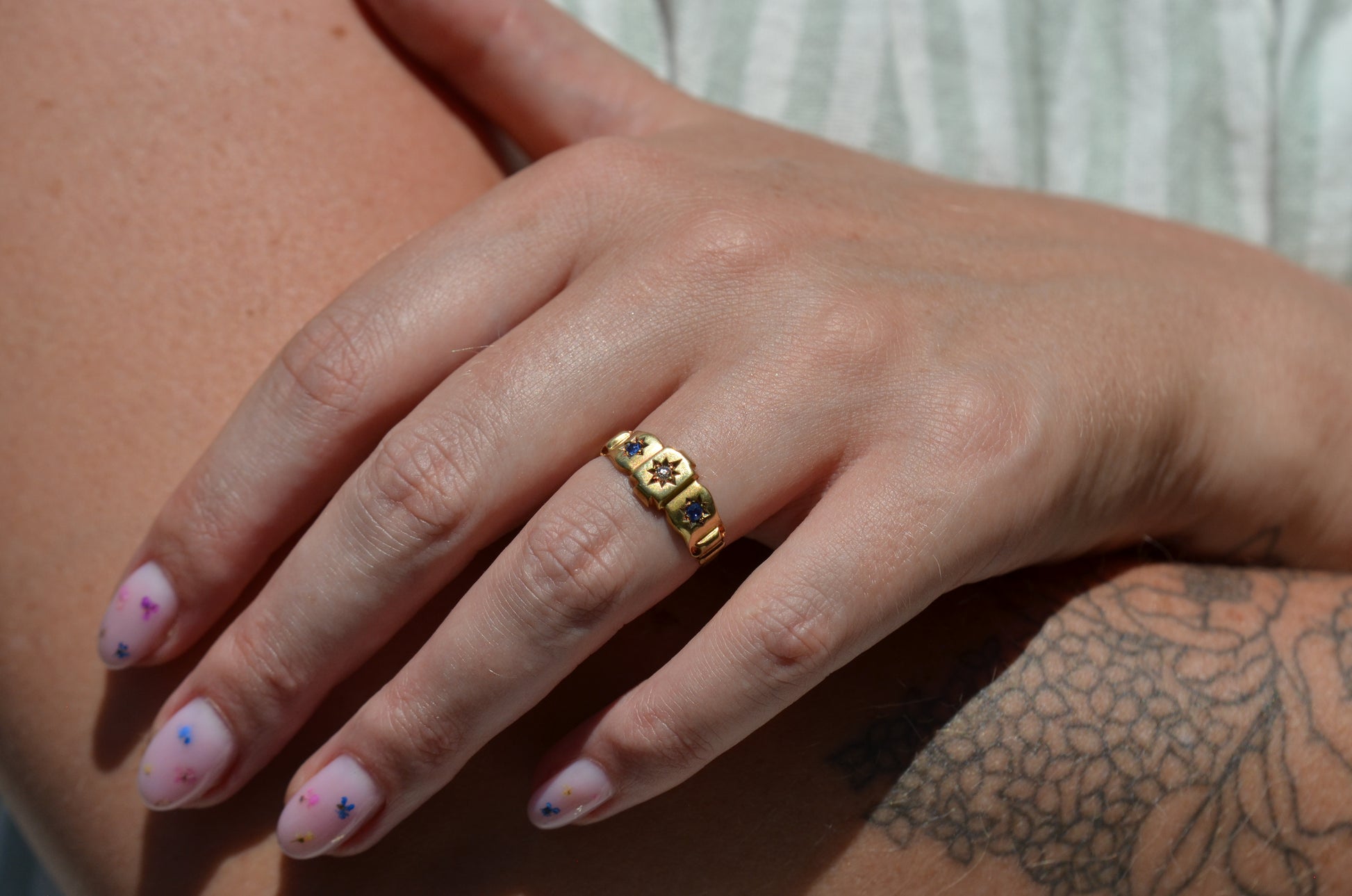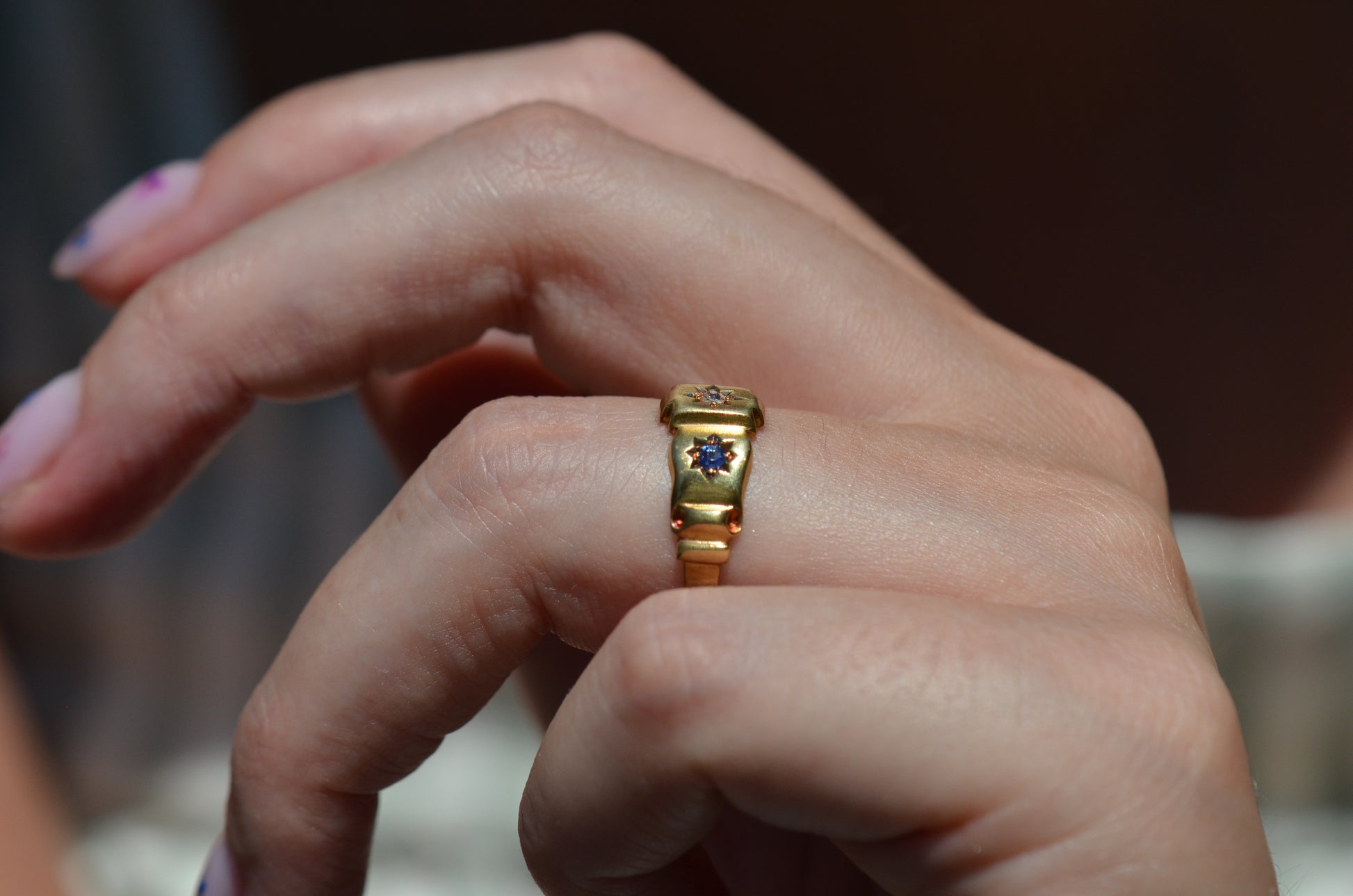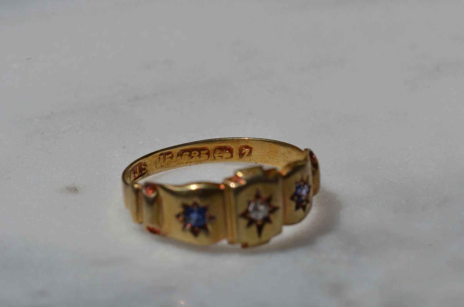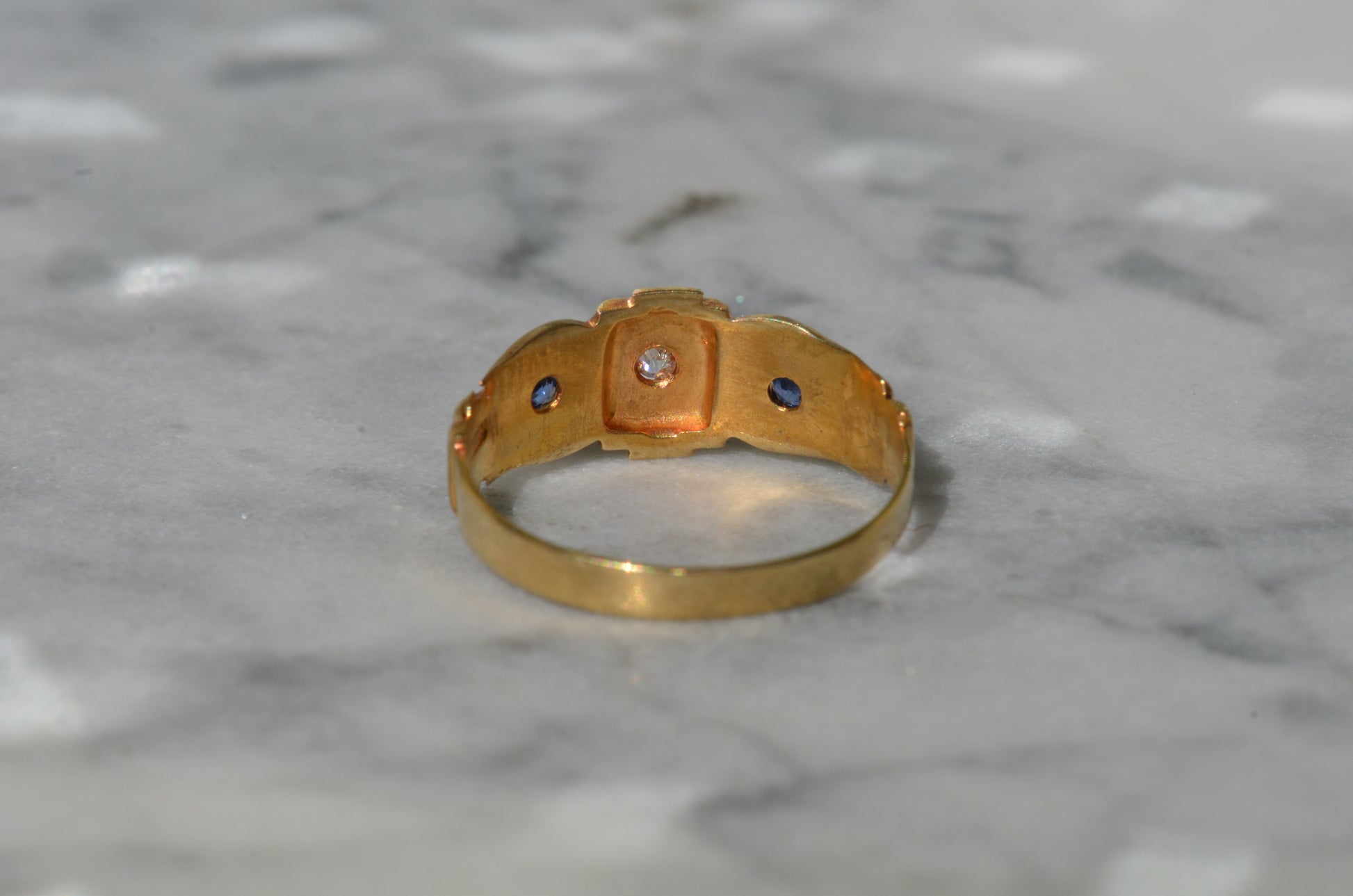 There is something so rich and inviting about the appearance of this Victorian ring: each stone, alternating sapphire and diamond, is set in its very own rectangular panel with scrolling edges curling inwards. Trilogy rings were a favourite of the era, and we love the way they offer broad finger coverage in a low-rise and easy to wear style. While this ring would make a dreamy solo or stacking ring, we also think it would be mightily romantic as an anniversary gift, an alternative engagement or wedding ring, or even a little something old AND blue on a wedding day.