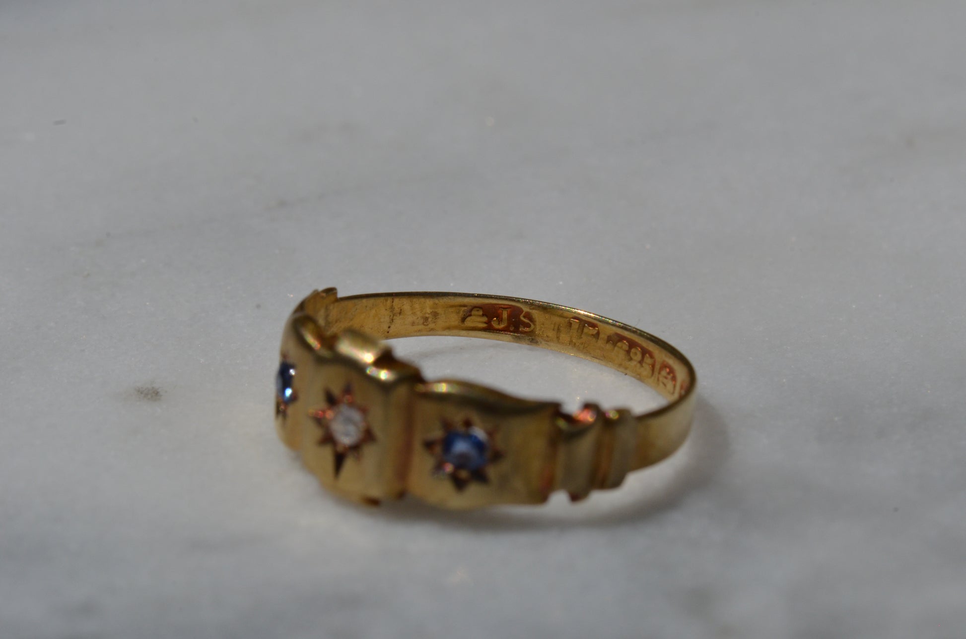• Two natural blue sapphires approximately 1.6mm each, one old mine cut diamond approximately 0.03ct