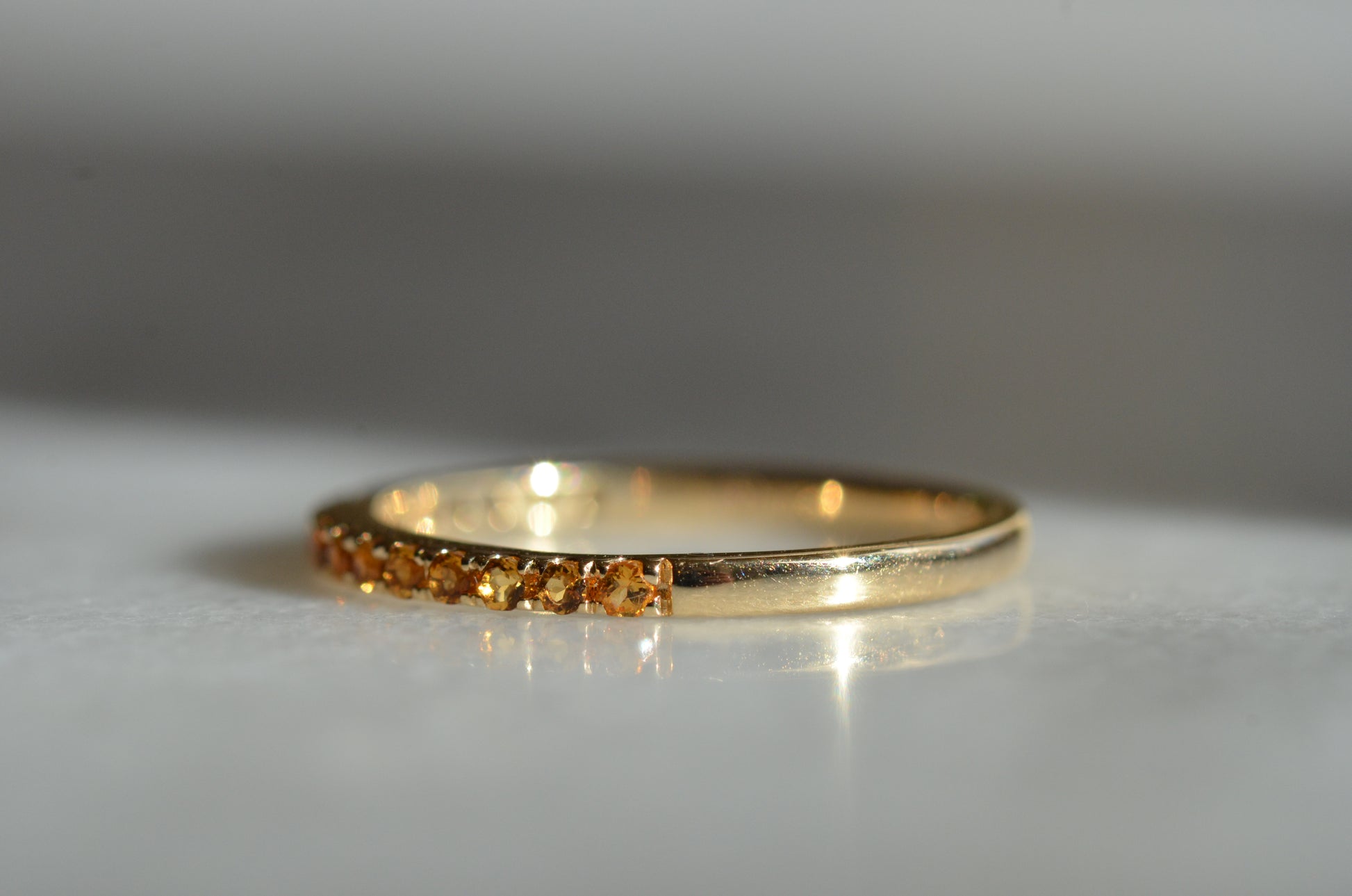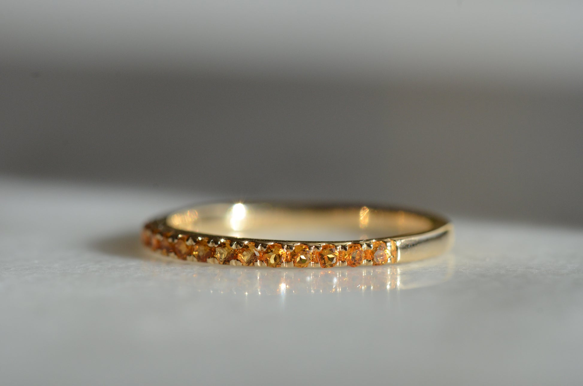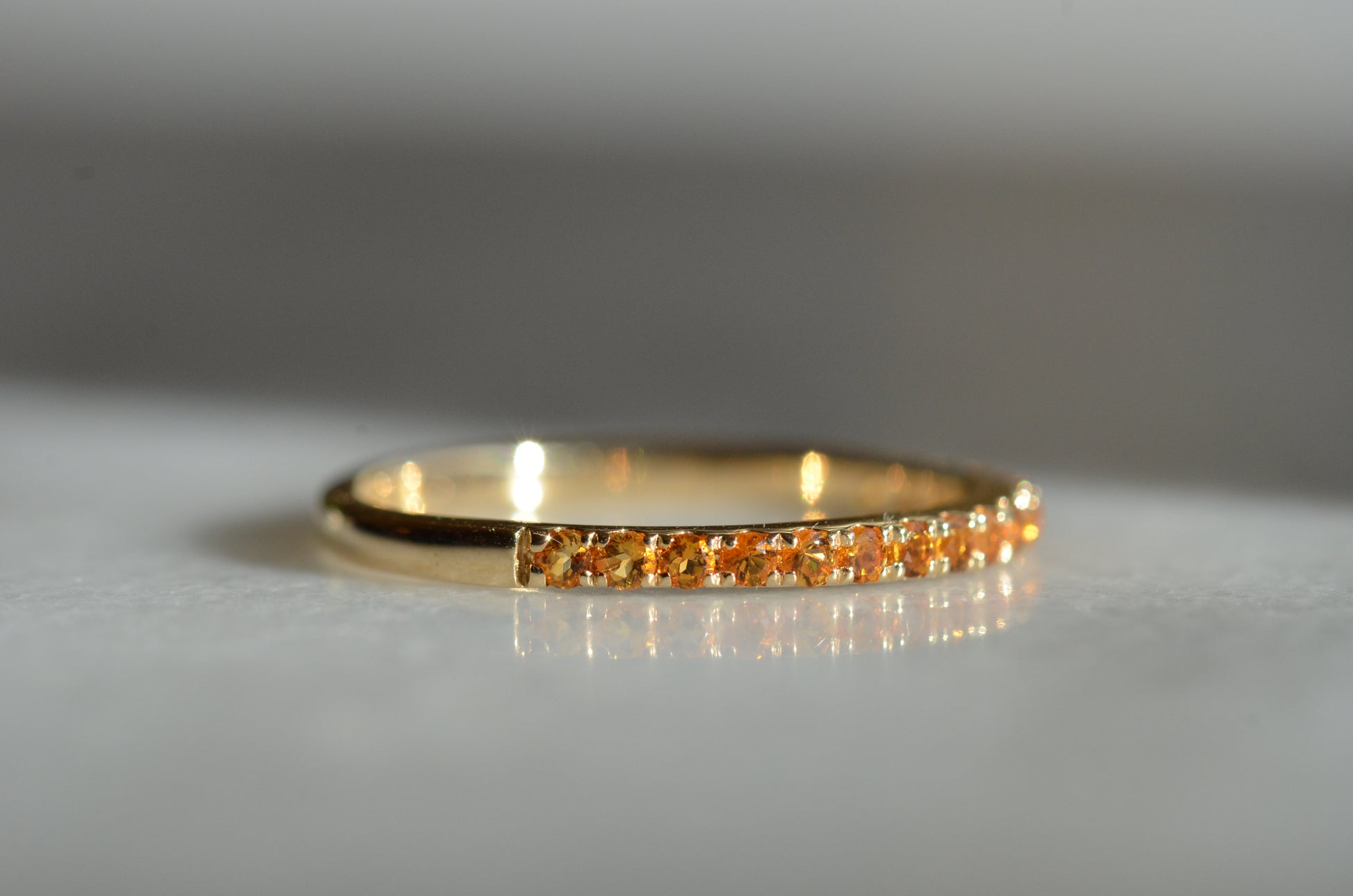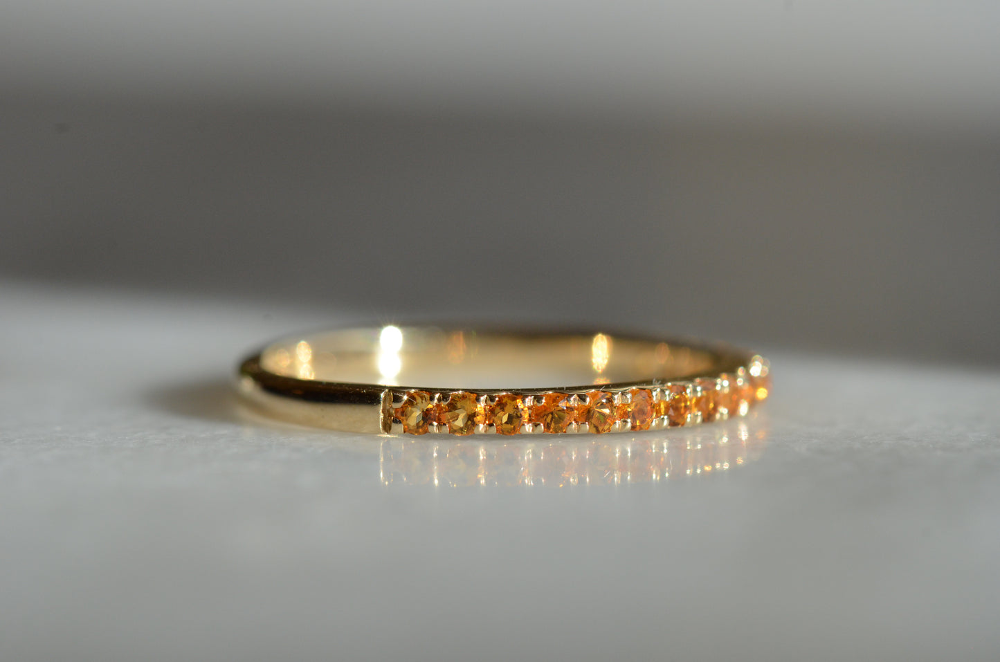 Rich orange-yellow stones like honey set in gold adorn this classic contemporary ring, catching the sunlight and appearing to hold it within their slim confines. Eternity and half-eternity styles have been popular across decades and generations for good reason: they look and feel deeply luxurious and yet also versatile, with sleek lines that allow for easy stacking and pairings.