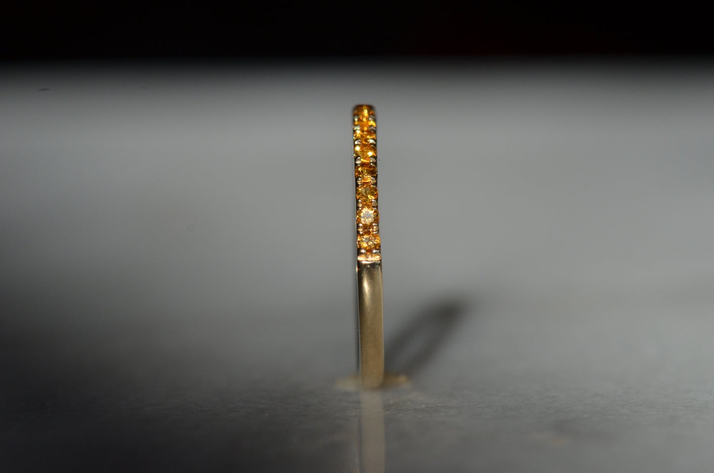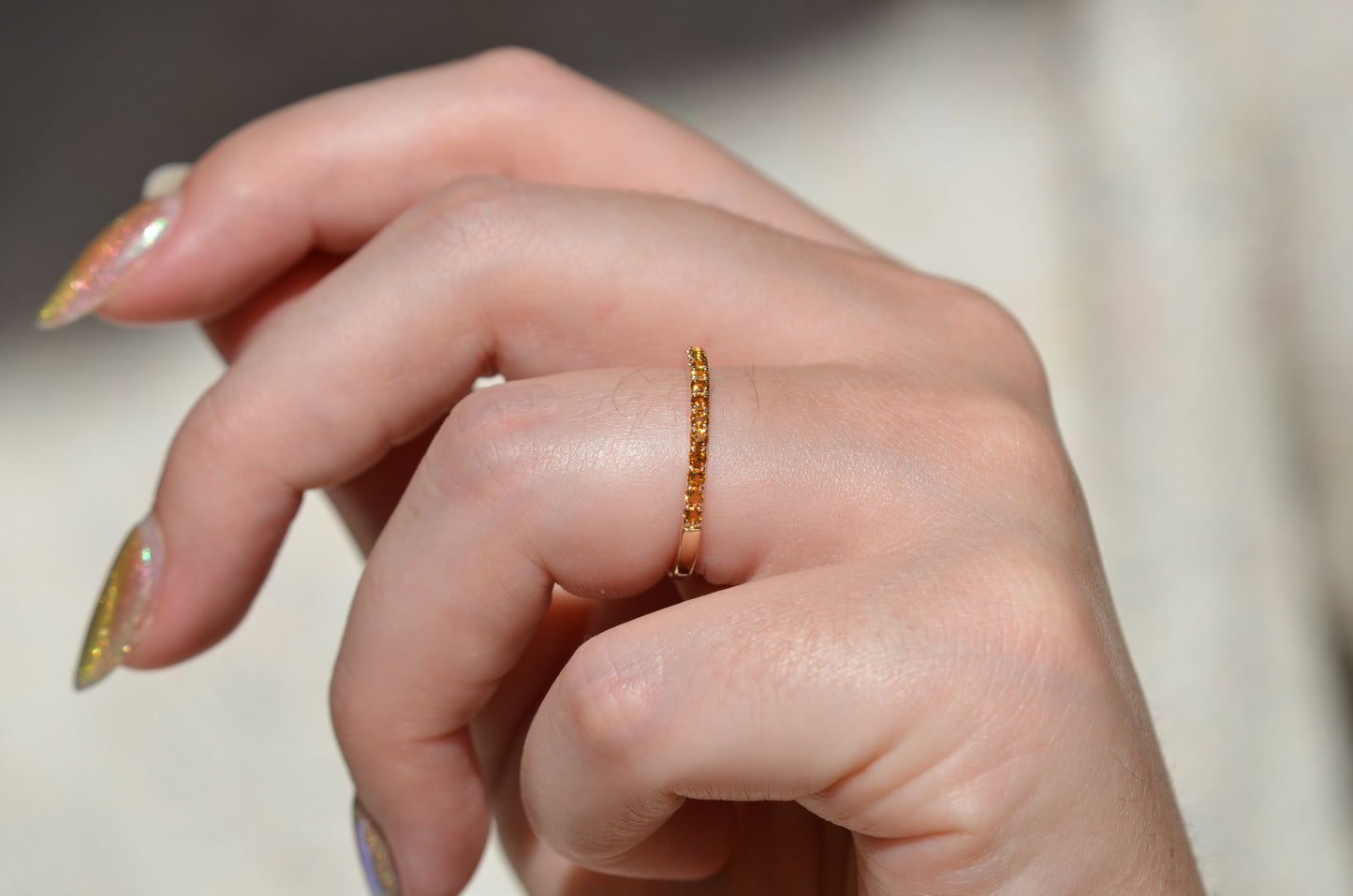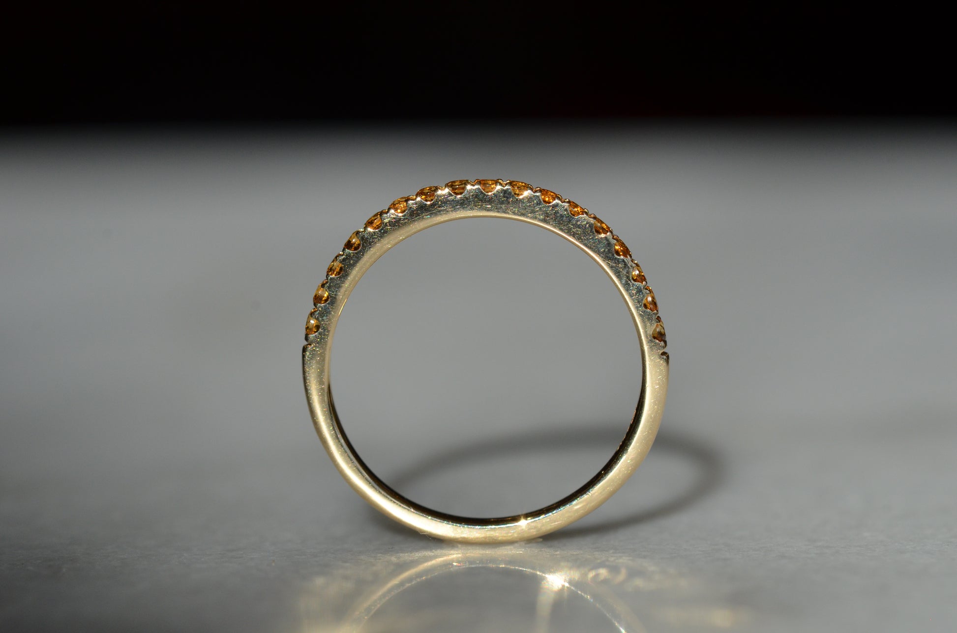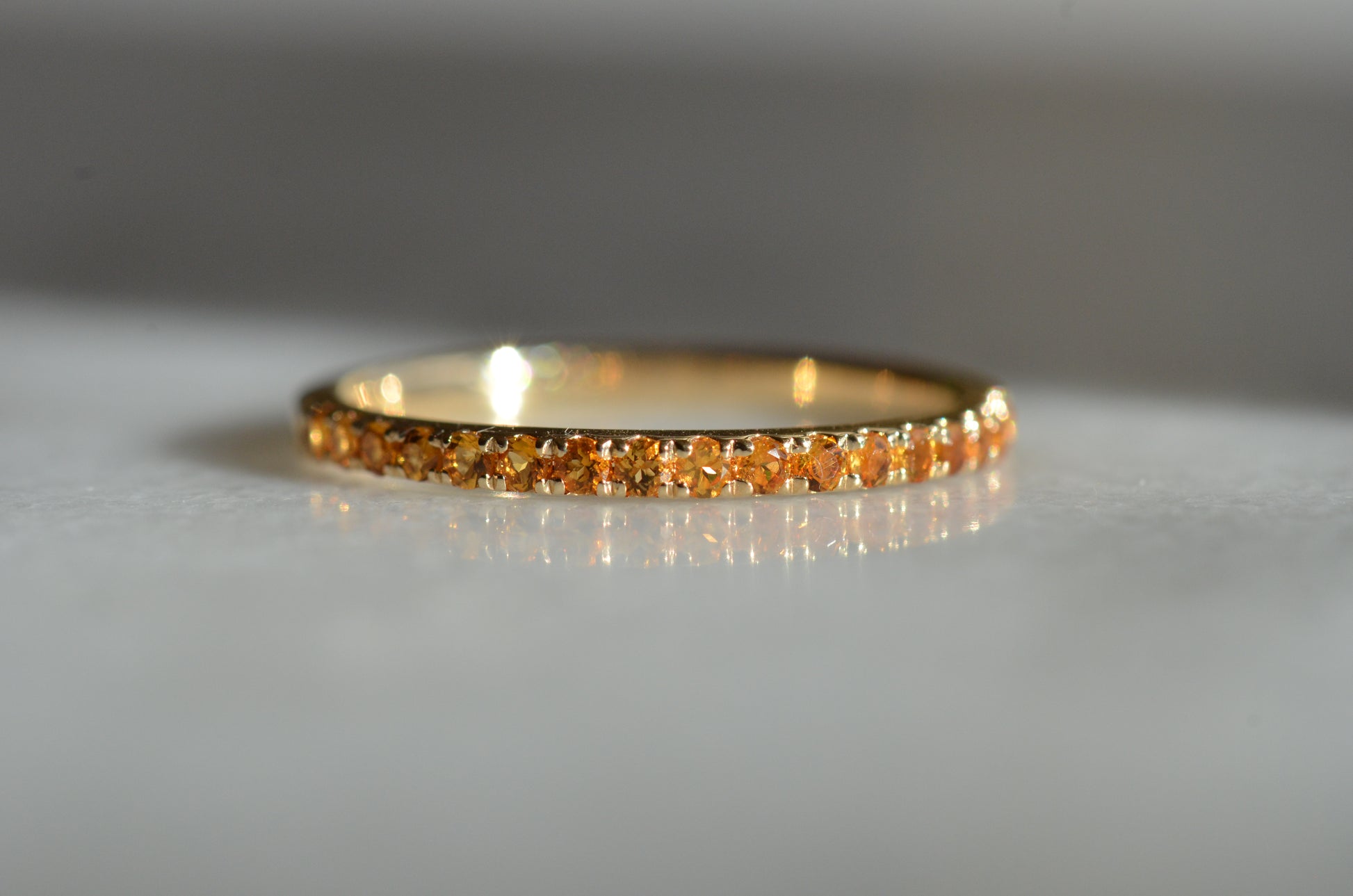Rich orange-yellow stones like honey set in gold adorn this classic contemporary ring, catching the sunlight and appearing to hold it within their slim confines. Eternity and half-eternity styles have been popular across decades and generations for good reason: they look and feel deeply luxurious and yet also versatile, with sleek lines that allow for easy stacking and pairings.
