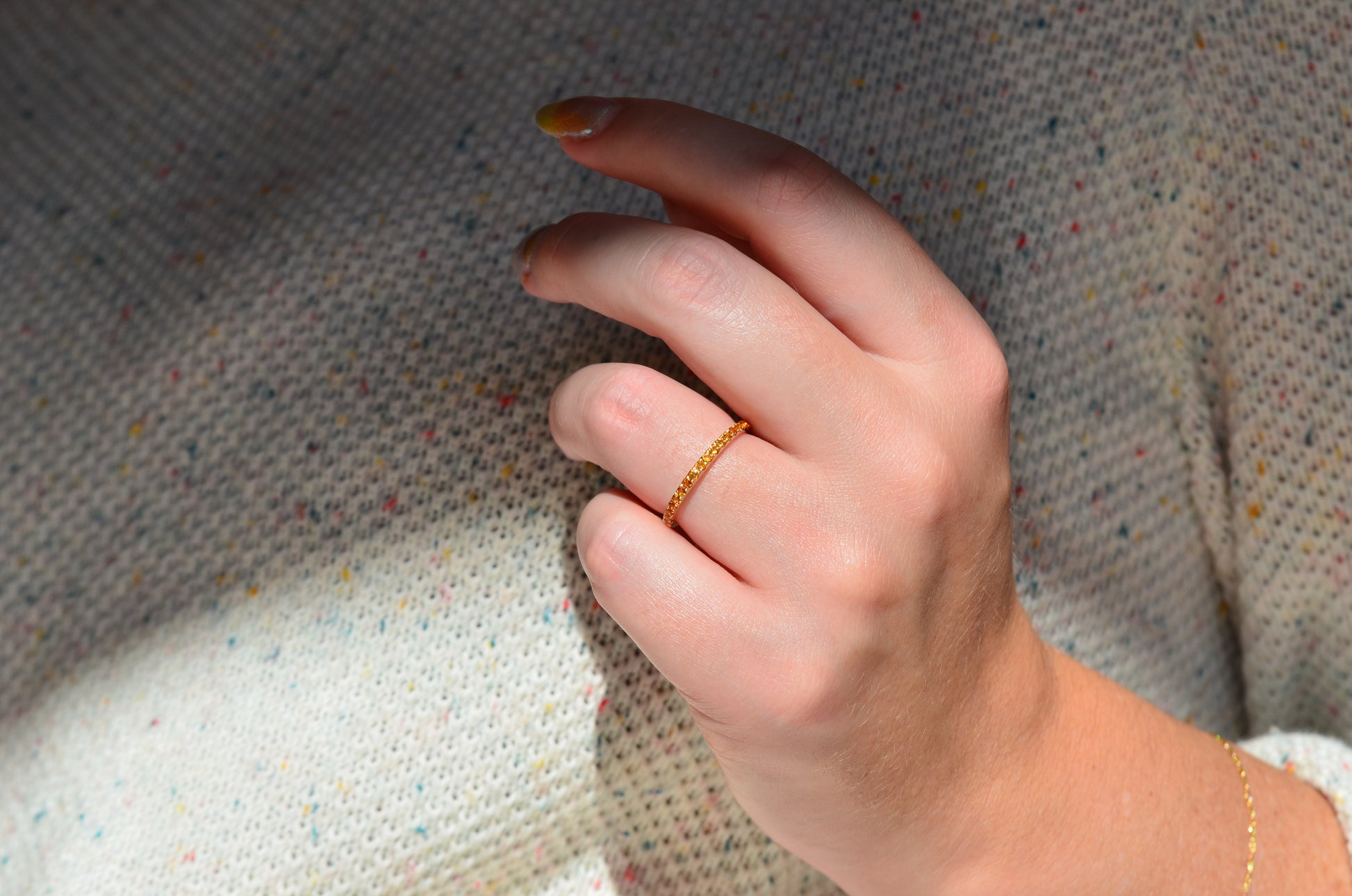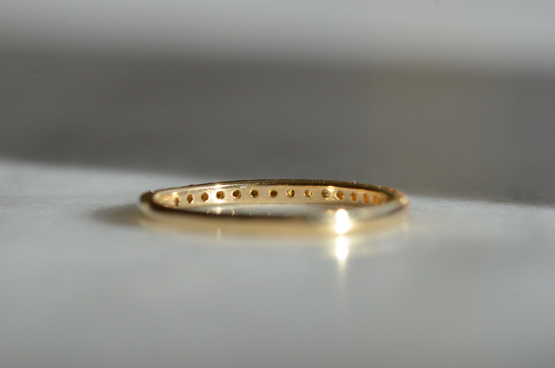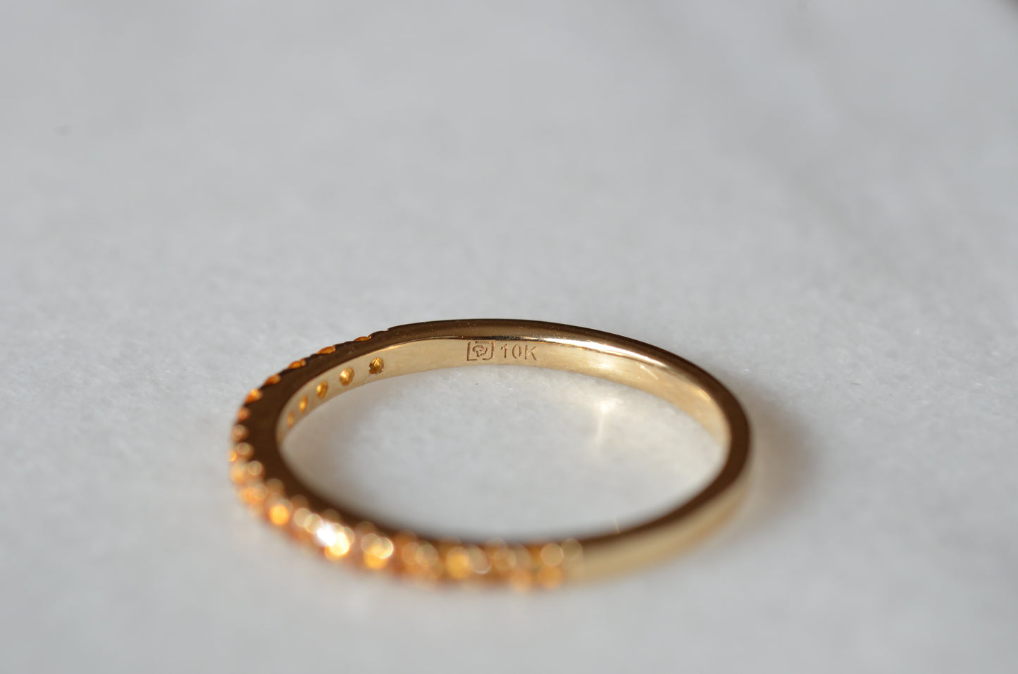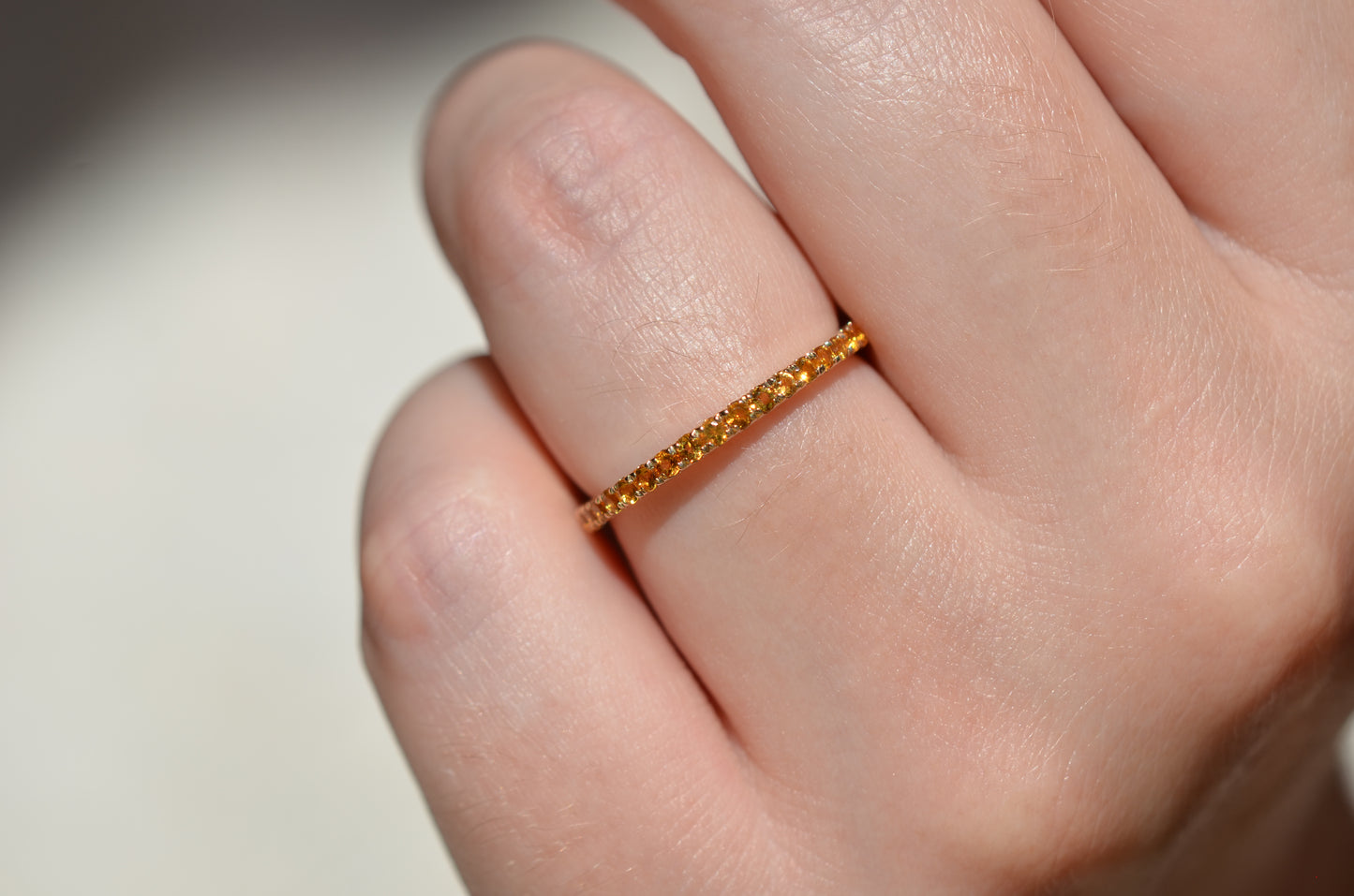 Rich orange-yellow stones like honey set in gold adorn this classic contemporary ring, catching the sunlight and appearing to hold it within their slim confines. Eternity and half-eternity styles have been popular across decades and generations for good reason: they look and feel deeply luxurious and yet also versatile, with sleek lines that allow for easy stacking and pairings.