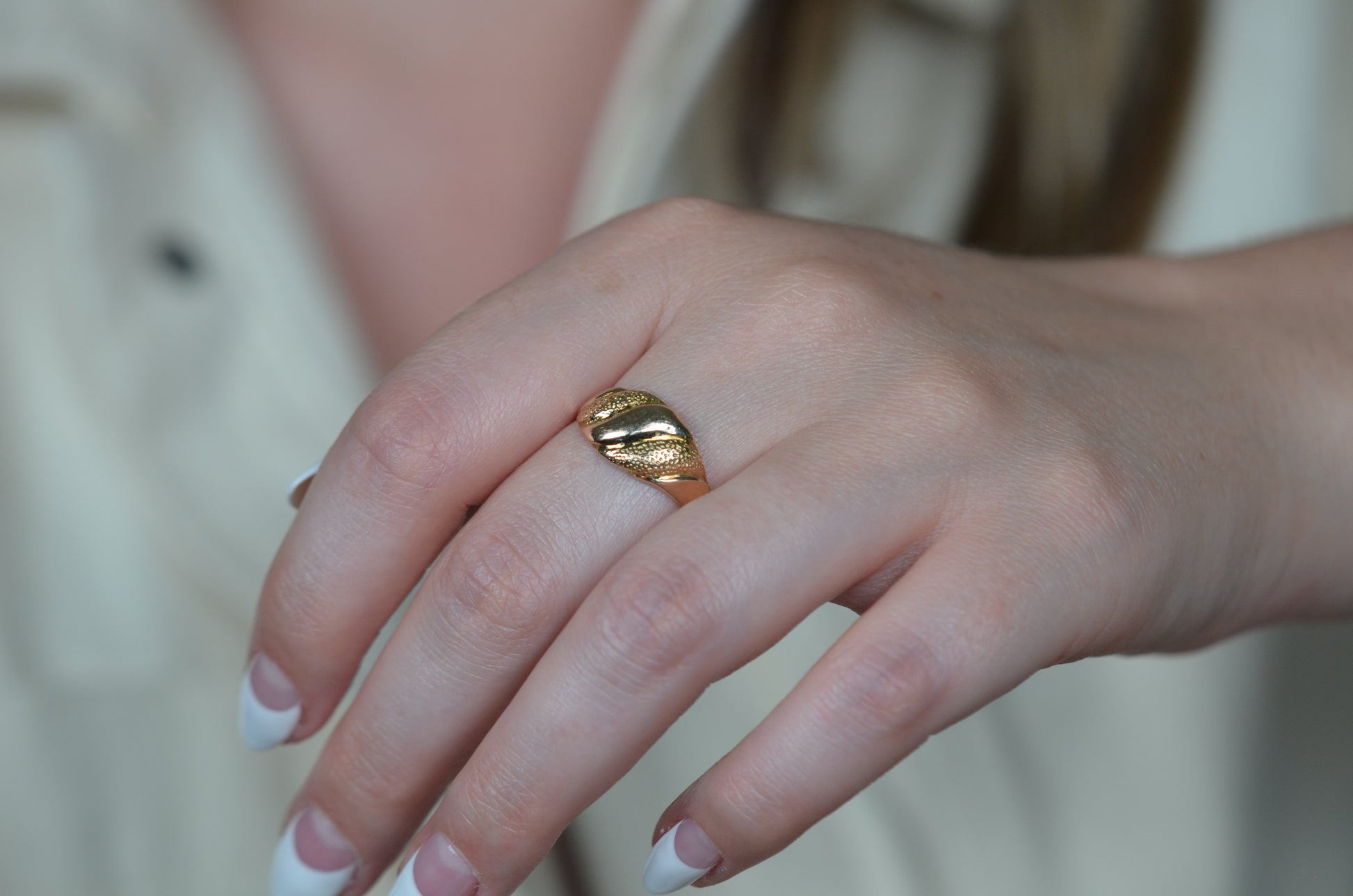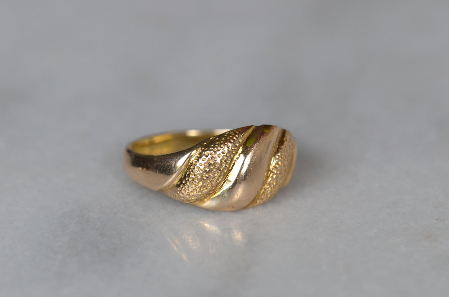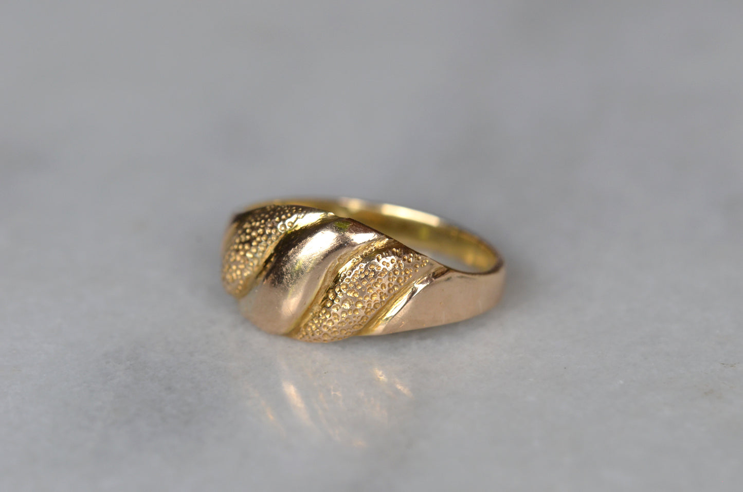 Soft, lapping waves in alternating smooth and textured gold. With gently domed volume, this ring reminds us of croissants and ocean waves all at once - like eating pastries on the beach. Let it remind you to be persistent, constant, and mysteriously ruled by the moon.