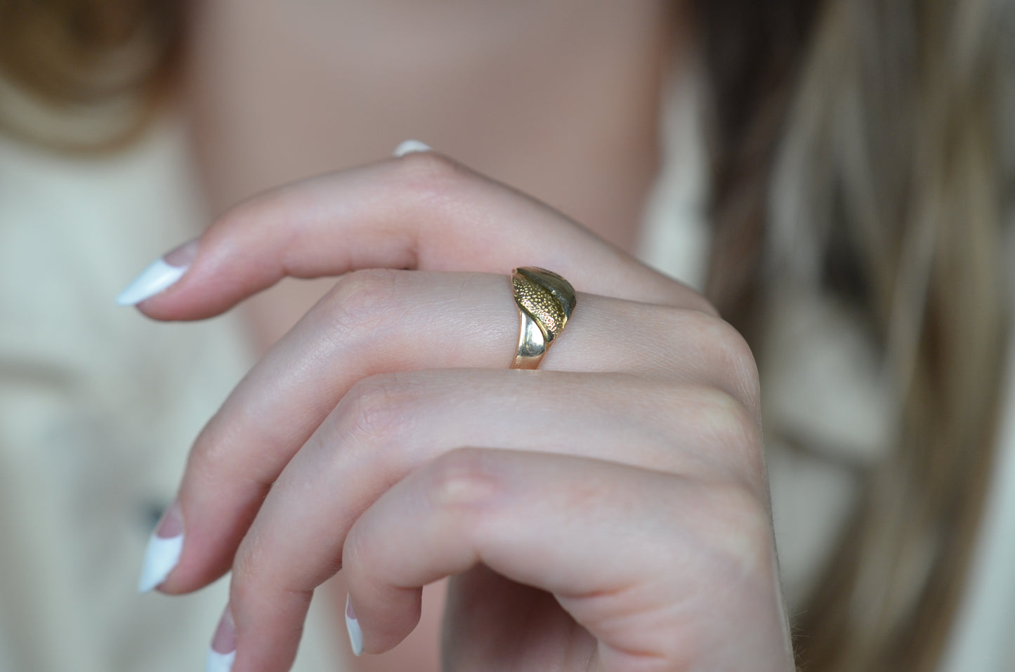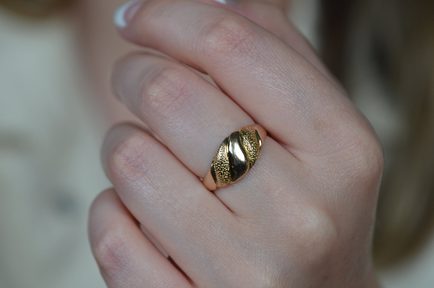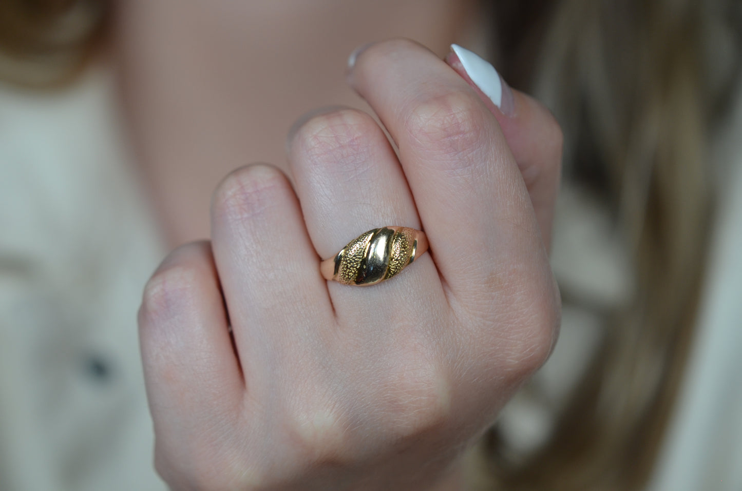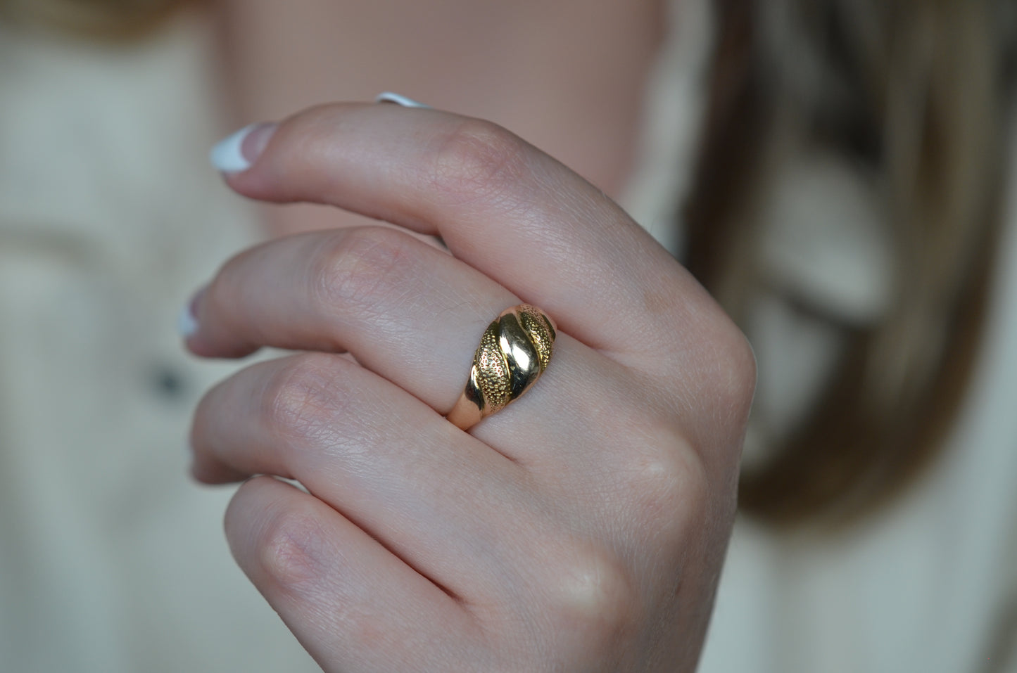 Soft, lapping waves in alternating smooth and textured gold. With gently domed volume, this ring reminds us of croissants and ocean waves all at once - like eating pastries on the beach. Let it remind you to be persistent, constant, and mysteriously ruled by the moon.