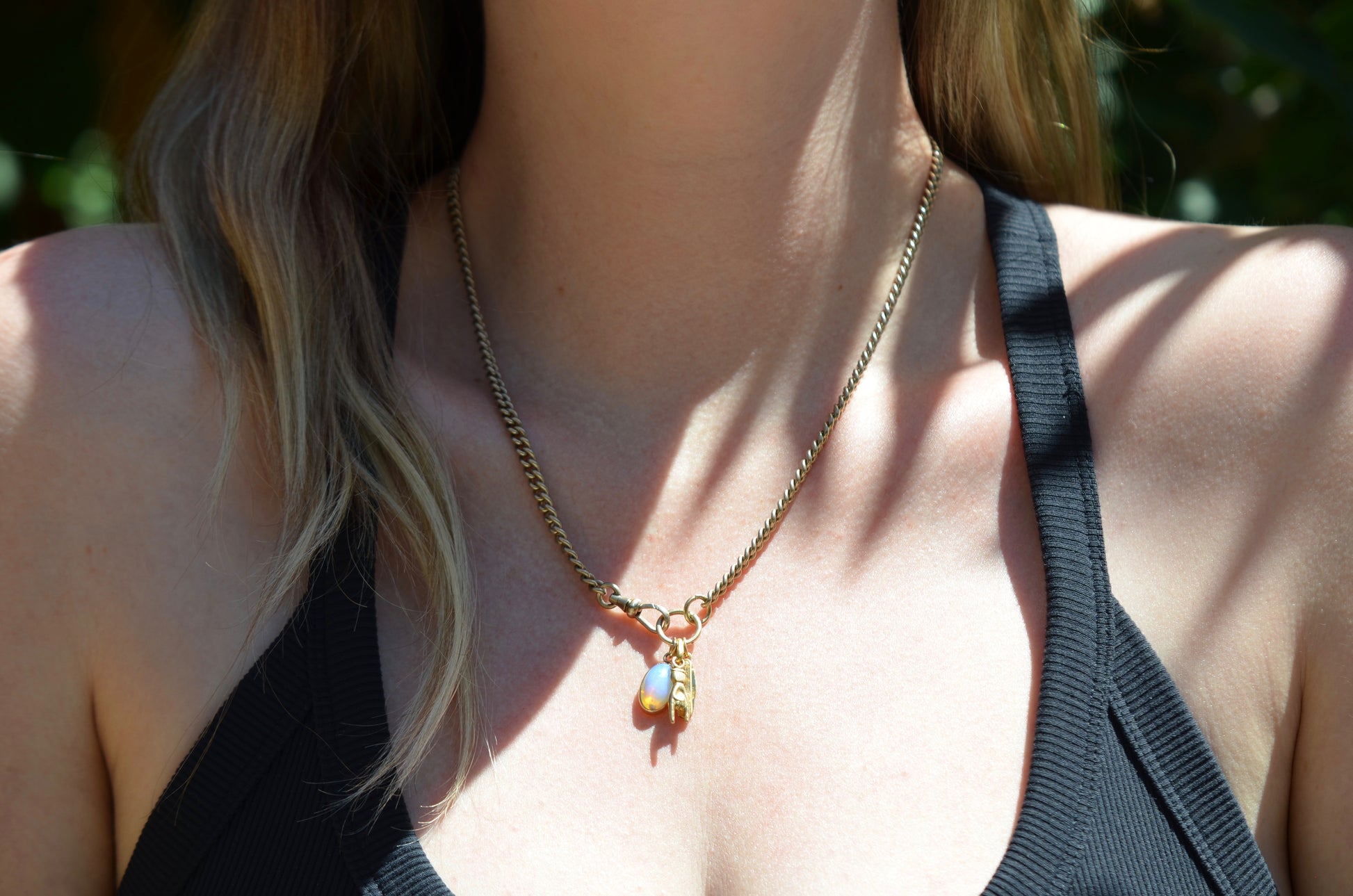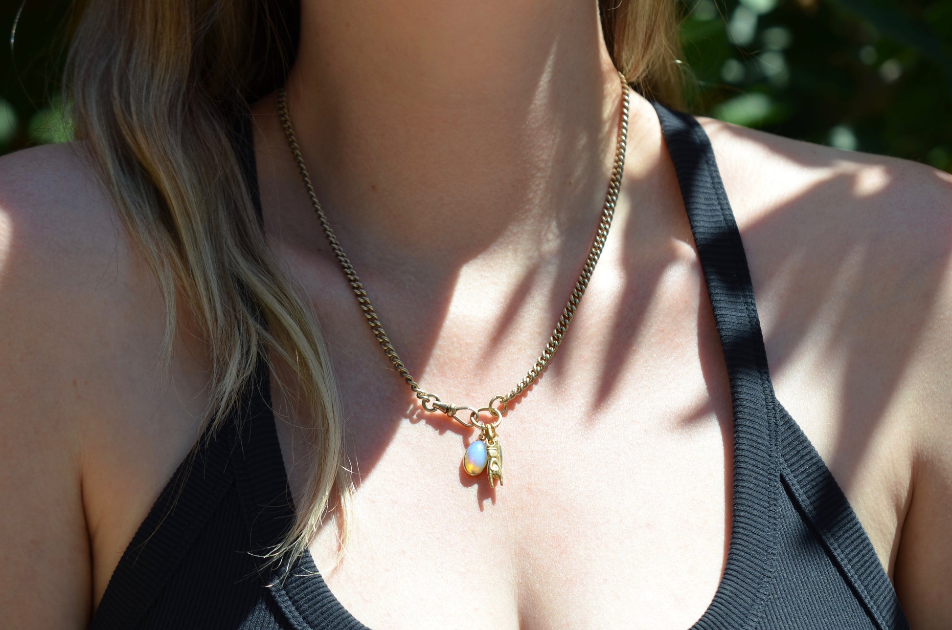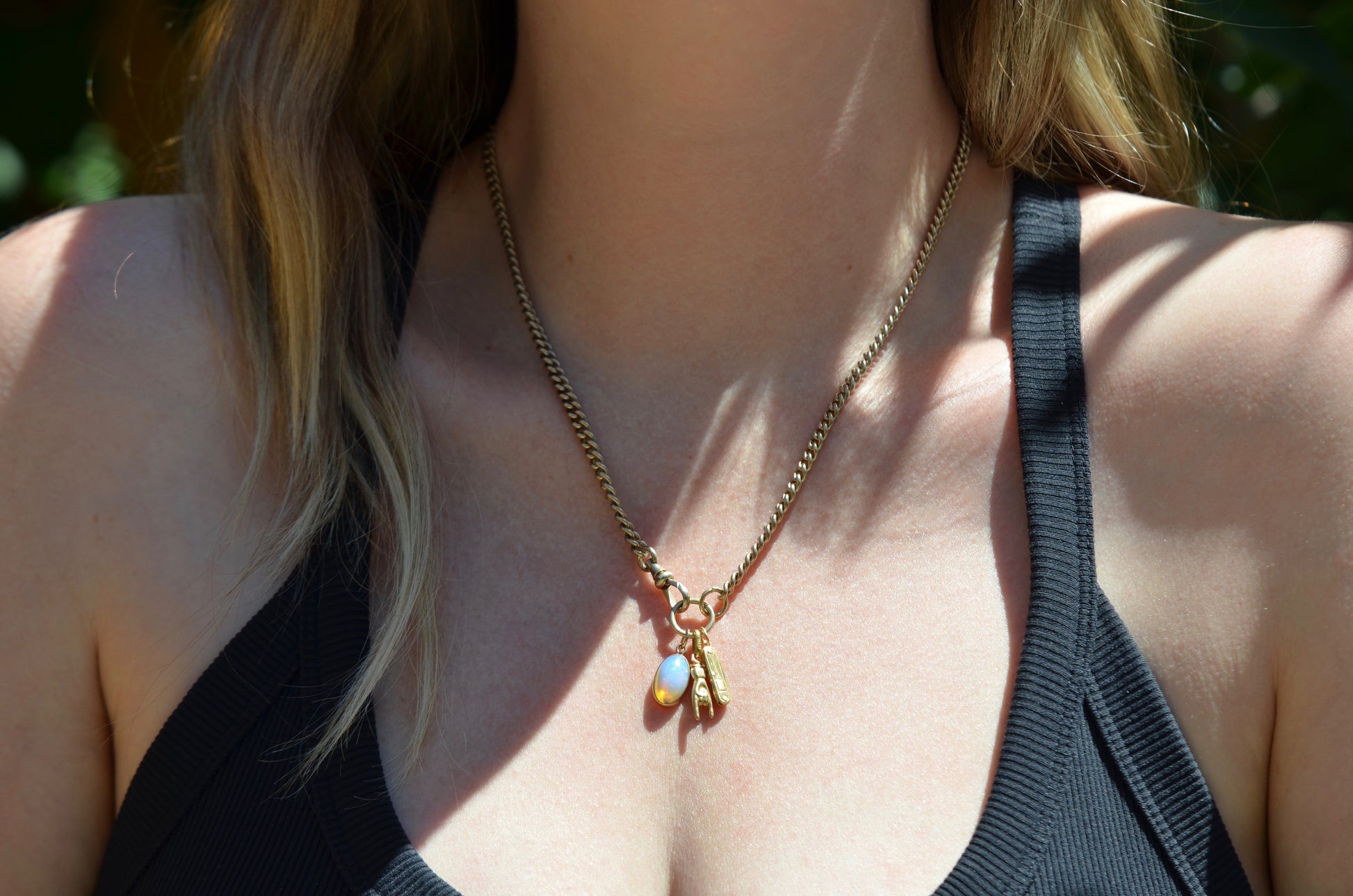 This absolutely beautiful, versatile, and highly covetable antique chain is sure to elevate any neck mess. At 19" long, and with a single dog clip closure, this chain is the perfect length to add a split ring full of your favourite charms and talismans (or attach them directly to the clip), and wear alone or layered with other necklaces.