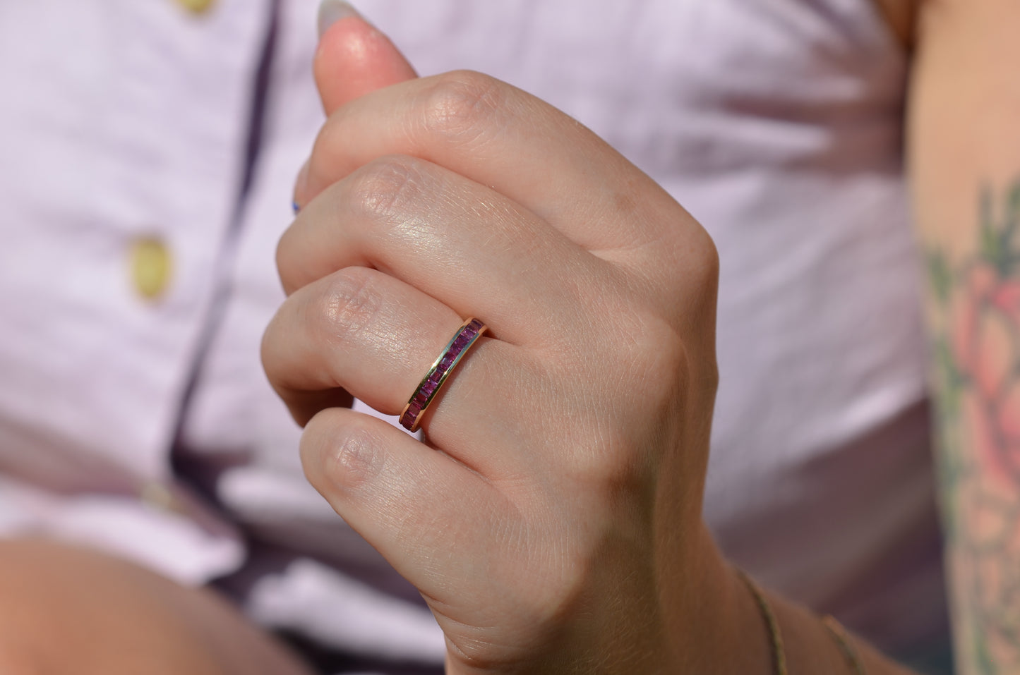 The little black dress of jewelry? More like the perfect pair of jeans - easy-wearing, low maintenance, perfectly broken in and goes with everything. A channel-set eternity band is a staple in any collection. Warm pinkish rubies give presence on the hand, while secure channel settings mean you can stack with anything without worrying about those little sparklers. Low-rise and durable, there's a reason channel-set rings have been beloved as wedding bands in the 1920s, 1950s, and especially the 1980s (hi, mum!). We love them as wedding bands today, or just as much as a solo staple or ring stack mainstay.