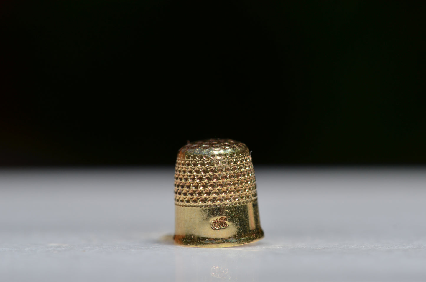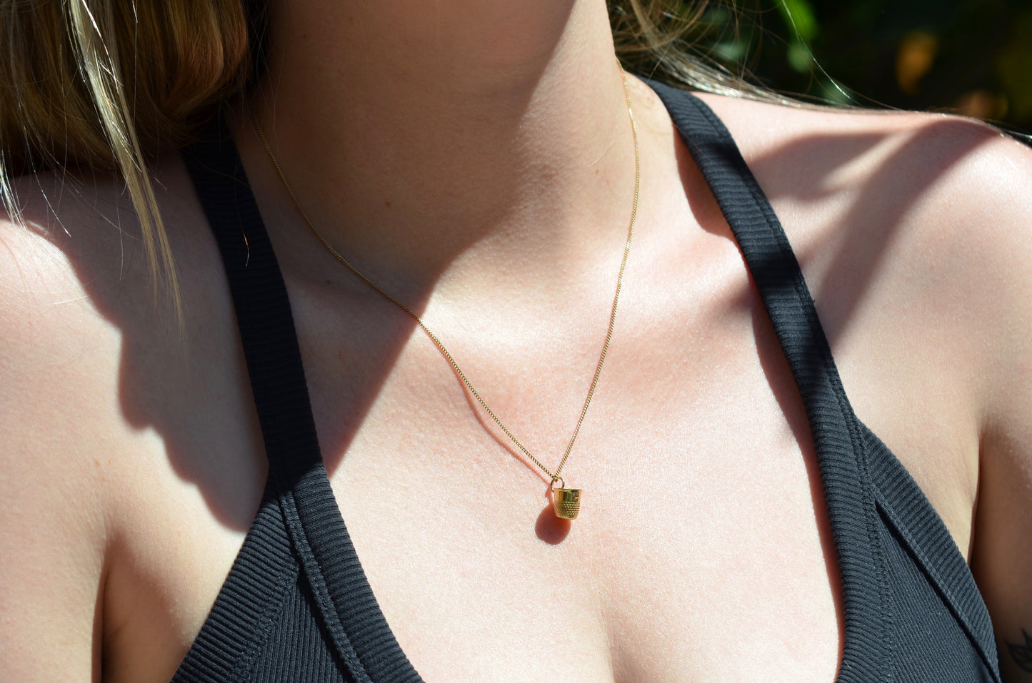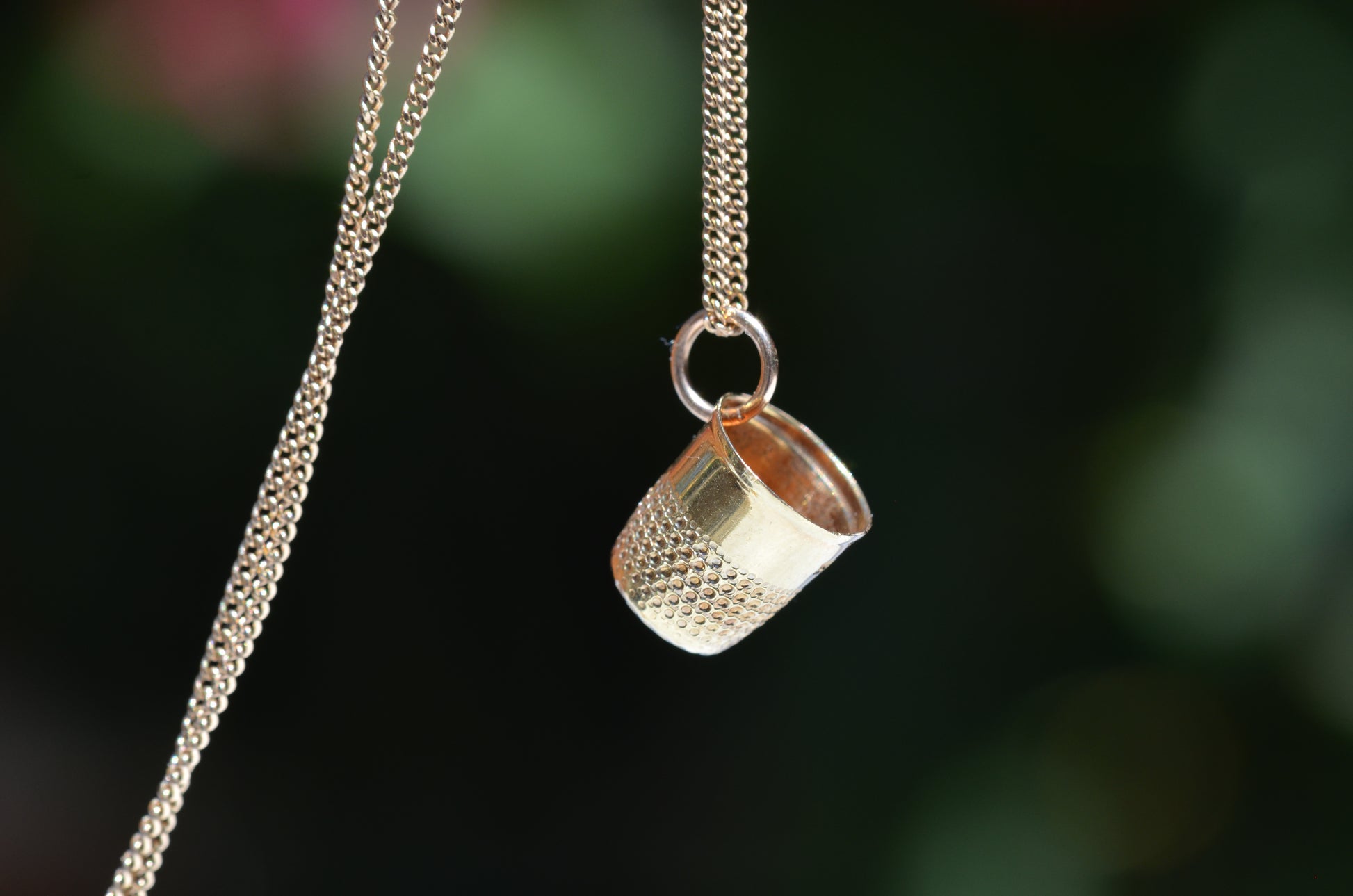 A sweet miniature pendant styled as a thimble, perfect for the designer, the maker, or the mender in your life! Made of solid gold, and a reminder to take care of yourself (as a protective piece of armour), and to respect the thoughtfulness and effort that goes into crafting a garment with care, and preserving the life of that piece.