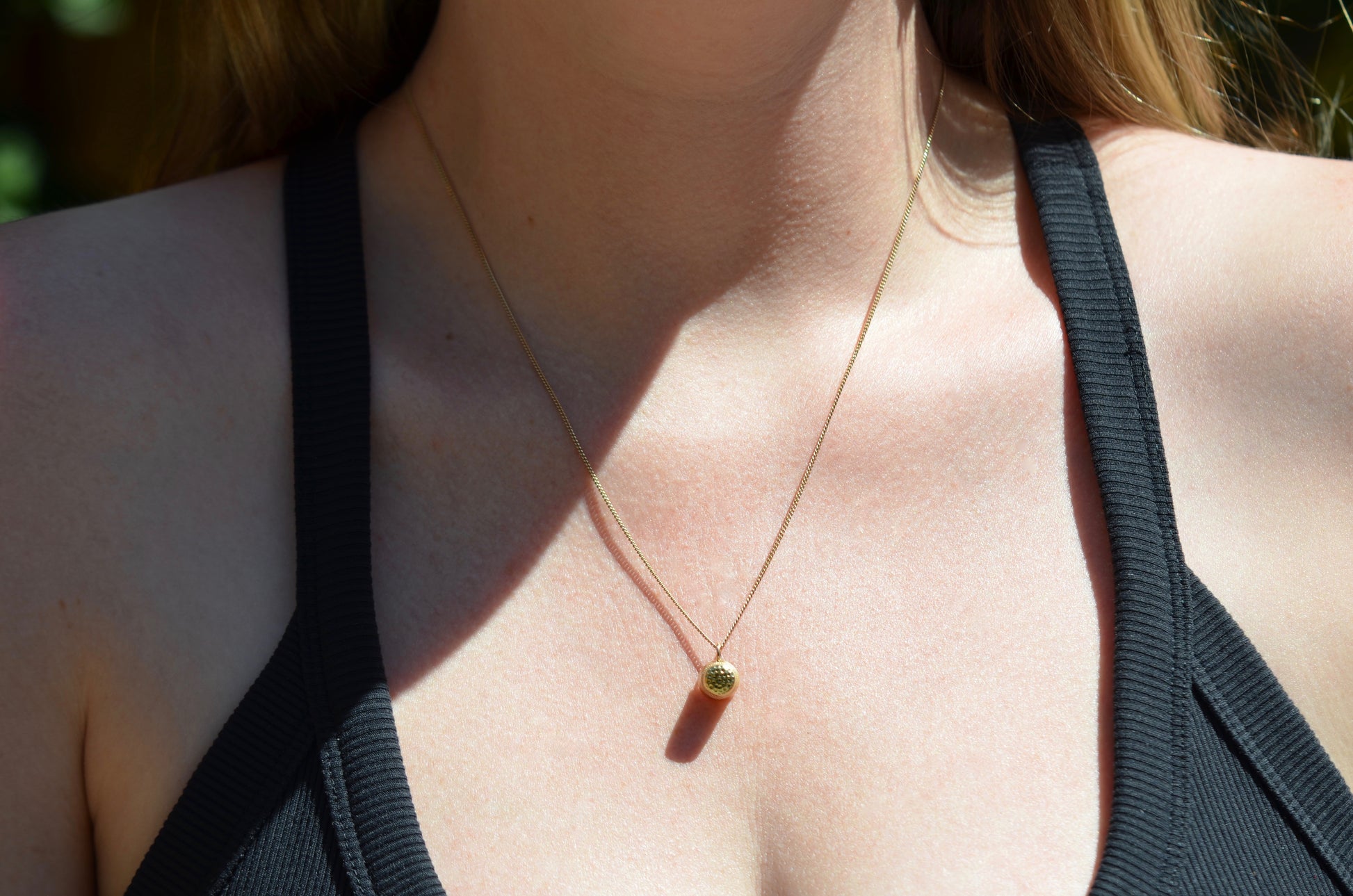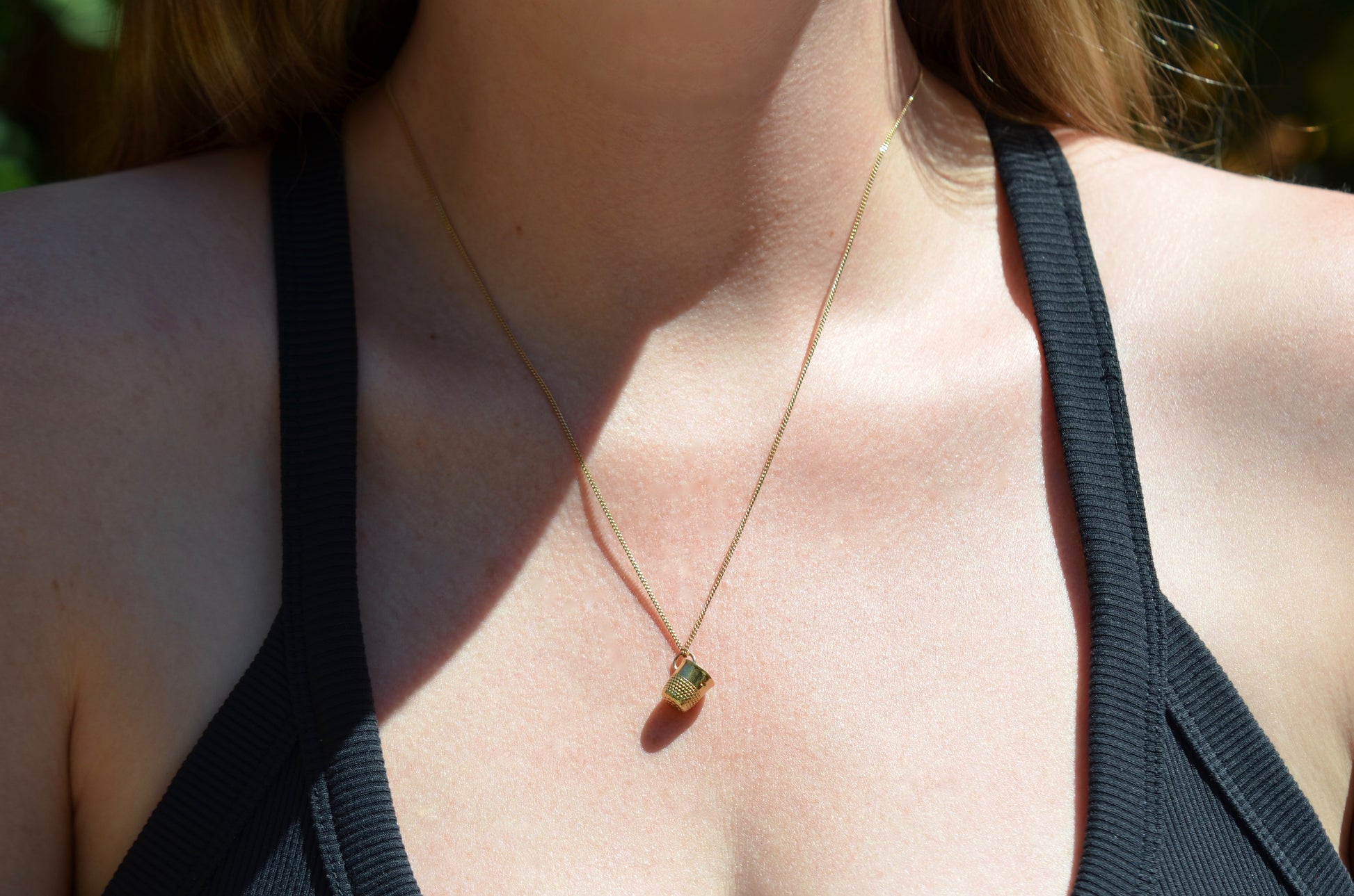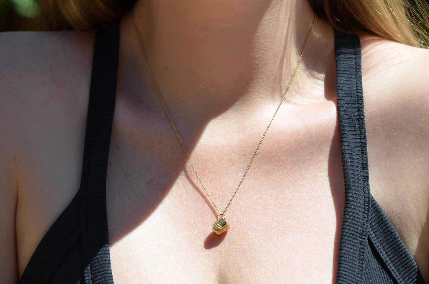 A sweet miniature pendant styled as a thimble, perfect for the designer, the maker, or the mender in your life! Made of solid gold, and a reminder to take care of yourself (as a protective piece of armour), and to respect the thoughtfulness and effort that goes into crafting a garment with care, and preserving the life of that piece.