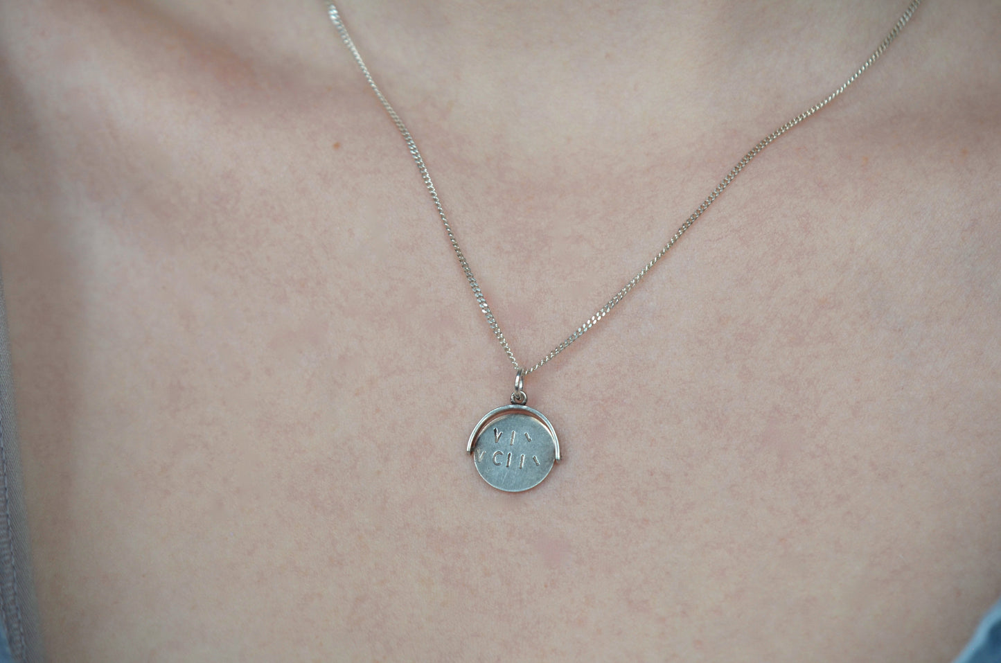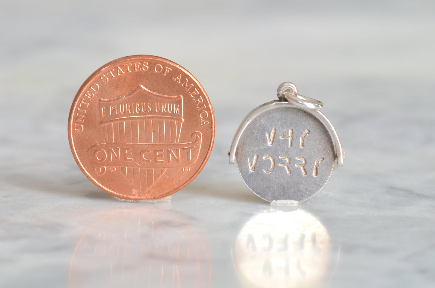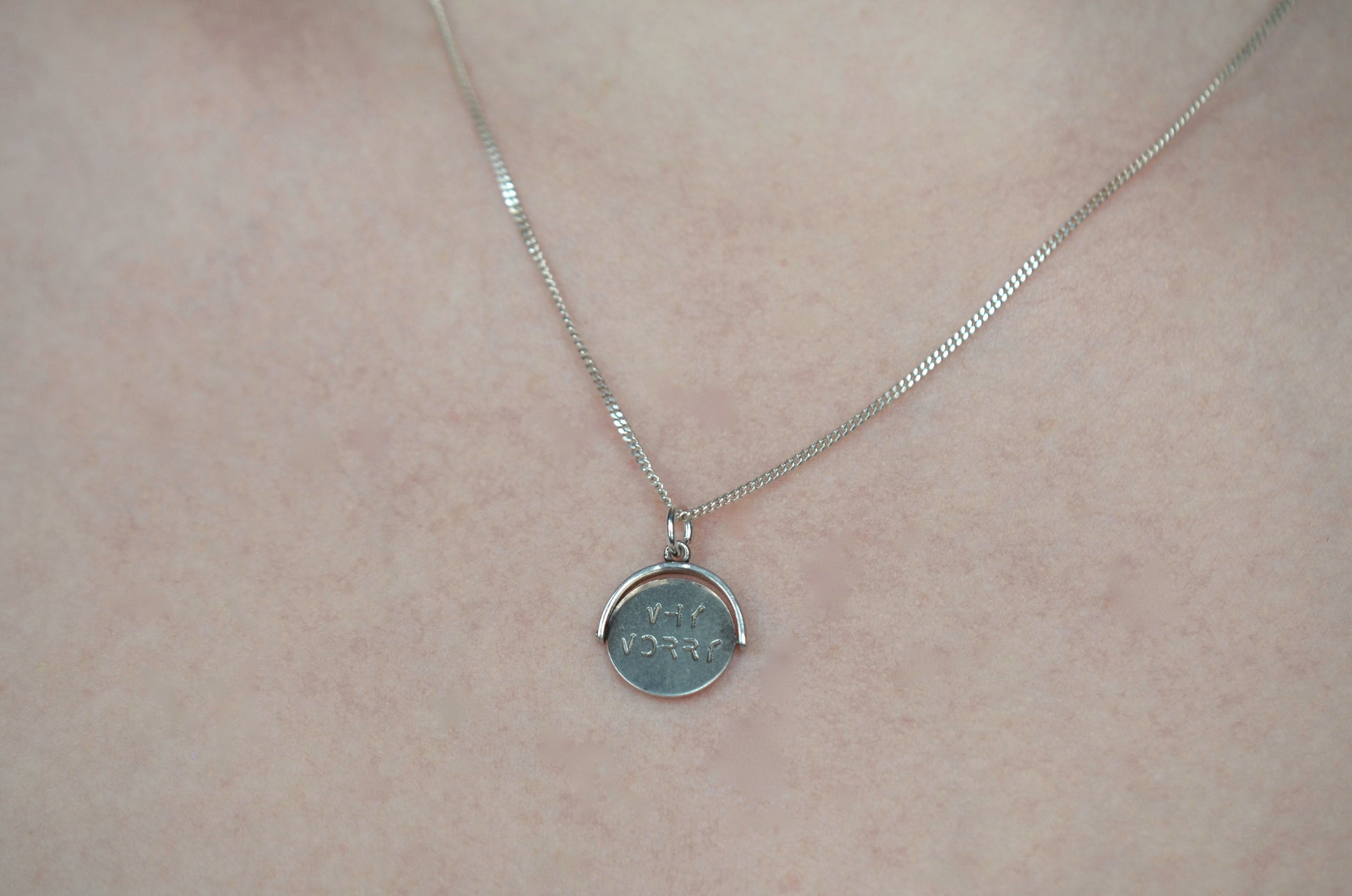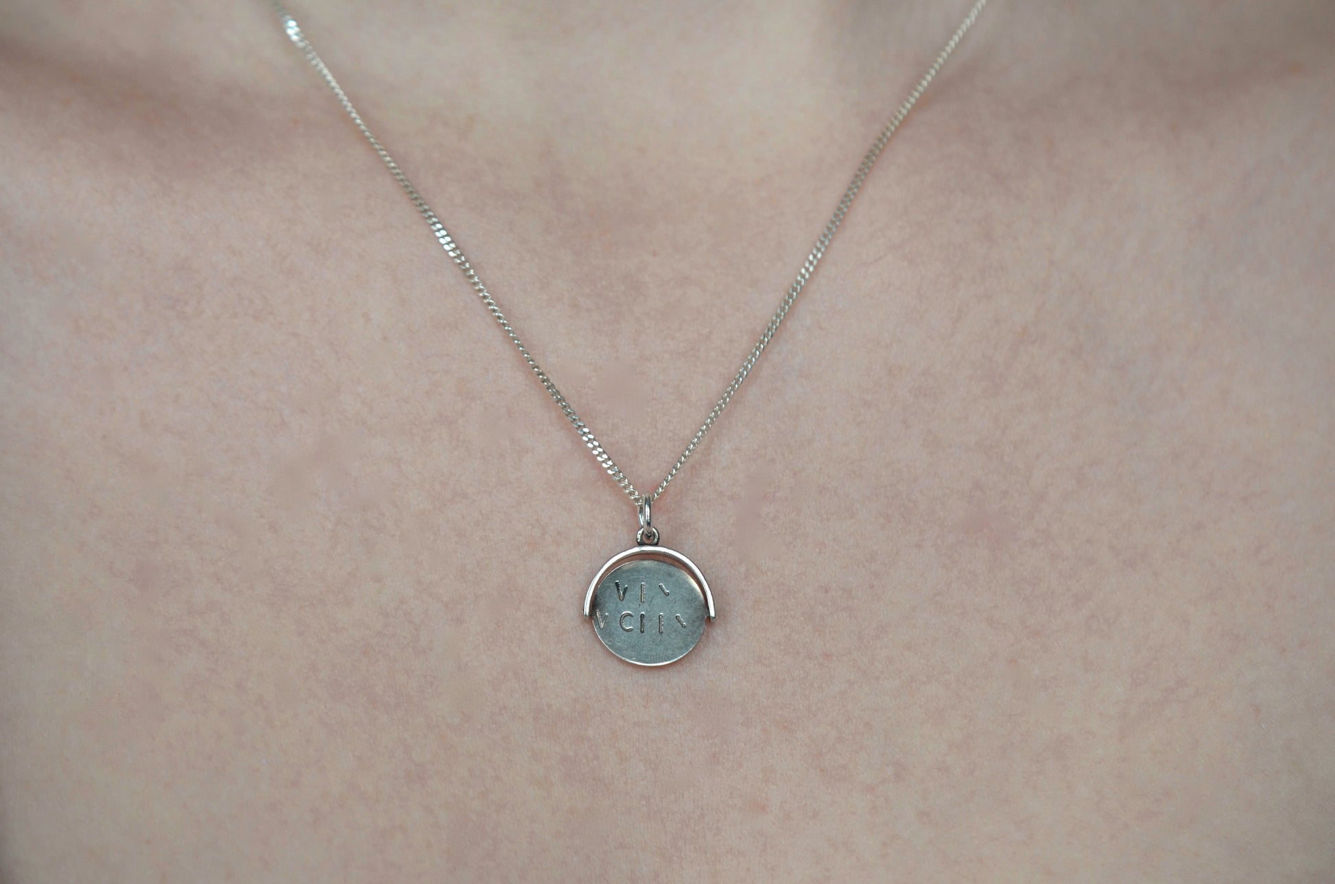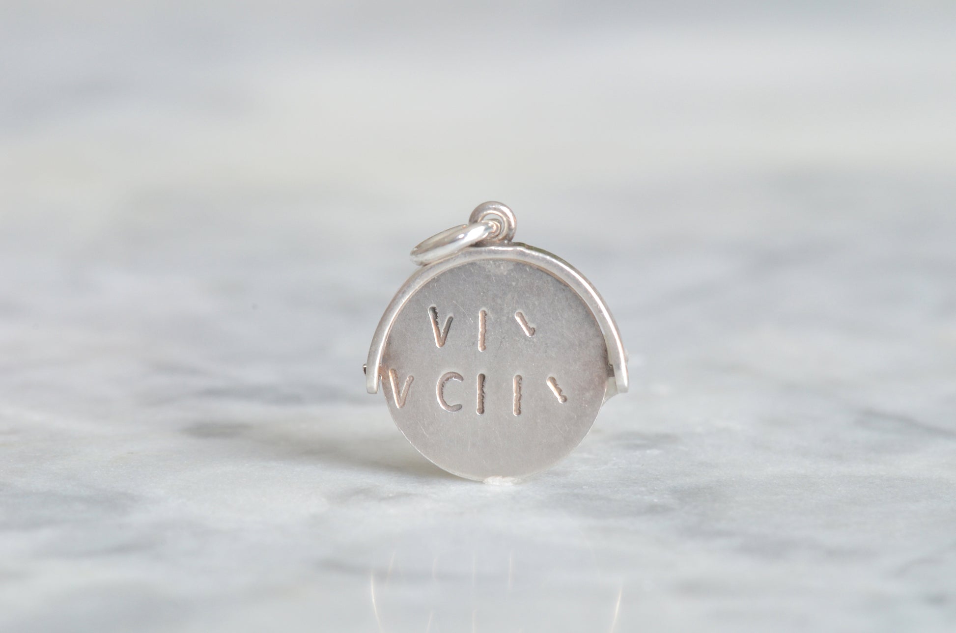 Straight from the mid-century charm craze, these delightful pieces can be added to your own charm bracelet or necklace, or worn alone on a chain to give them all the focus. Each side of the disc bears only a portion of each letter, creating a secret message that is only revealed when the disc is spun and in motion.