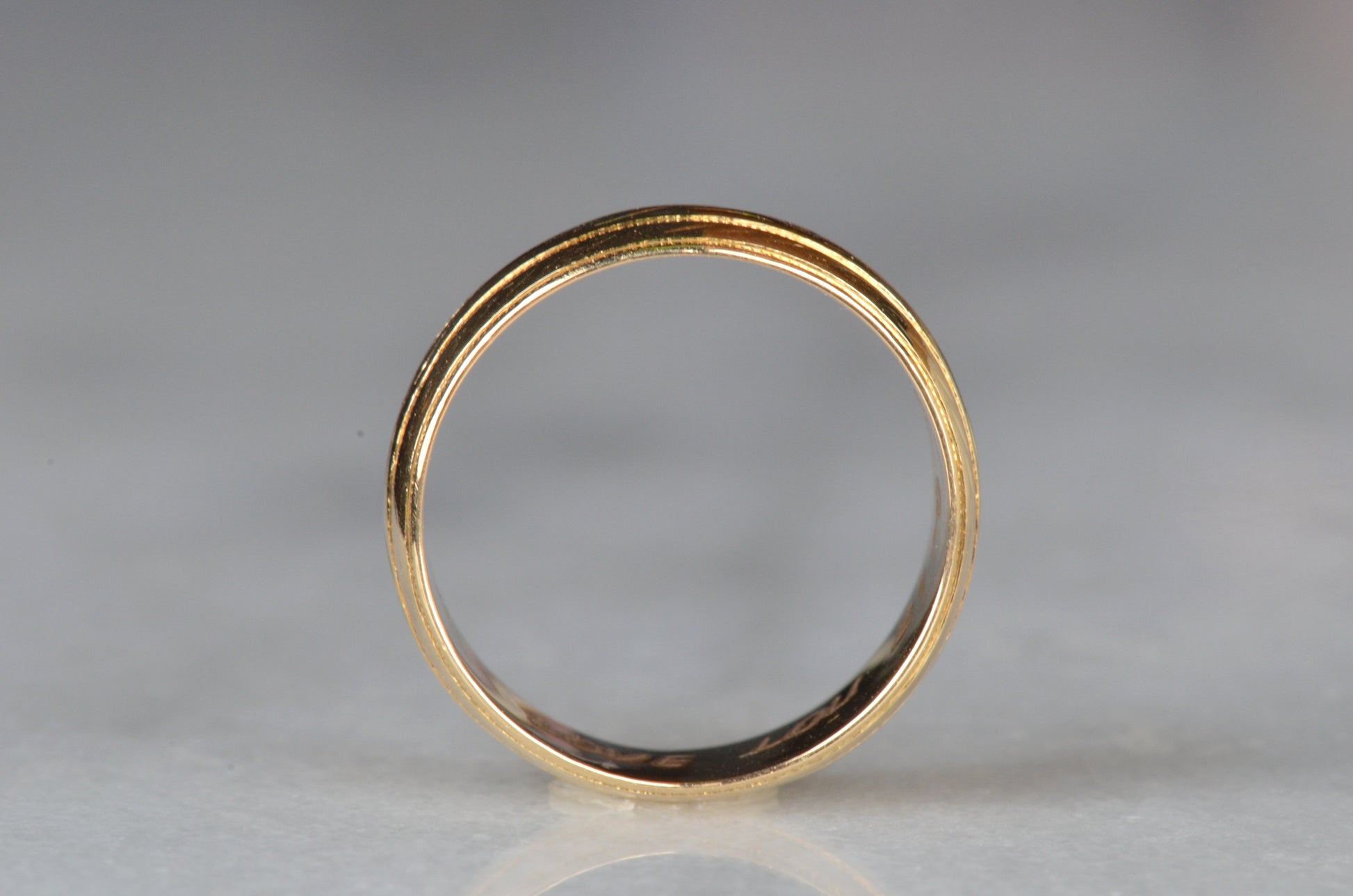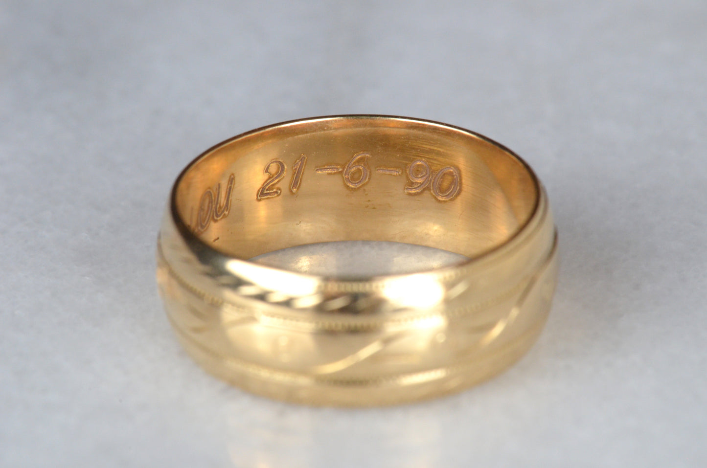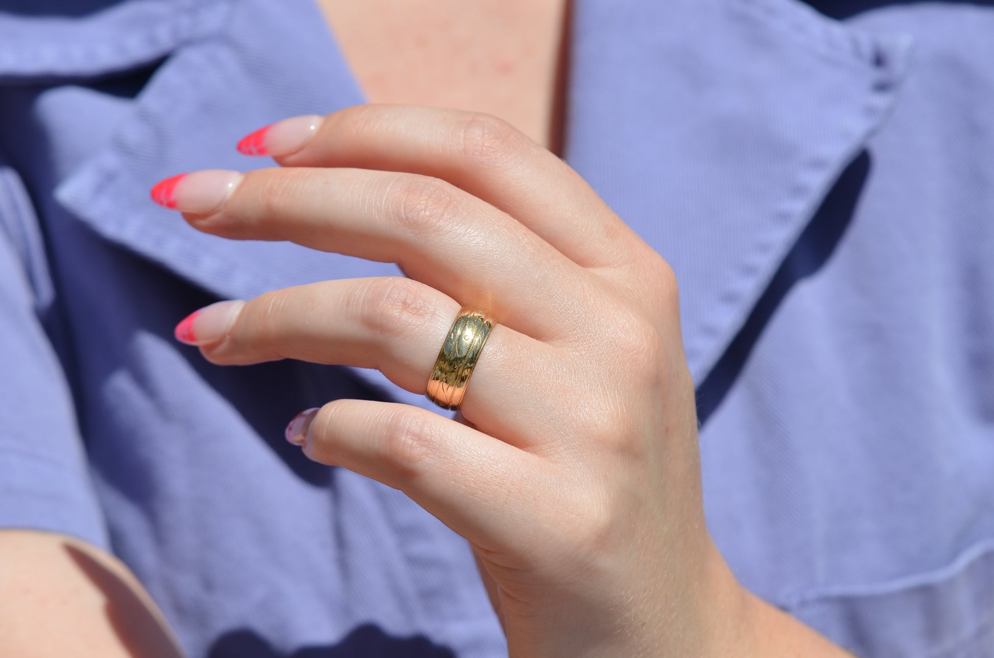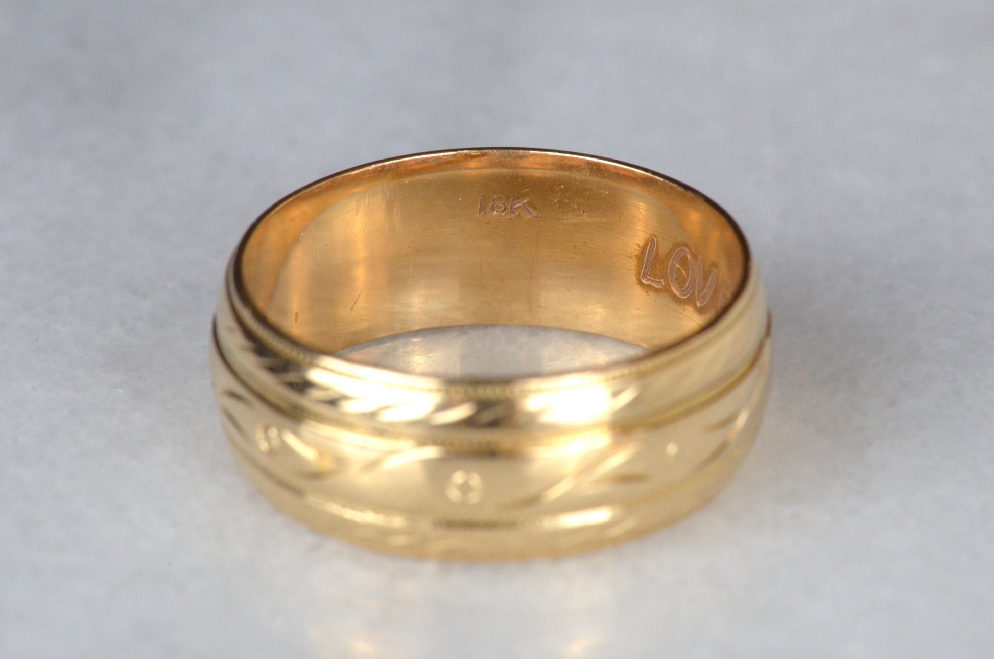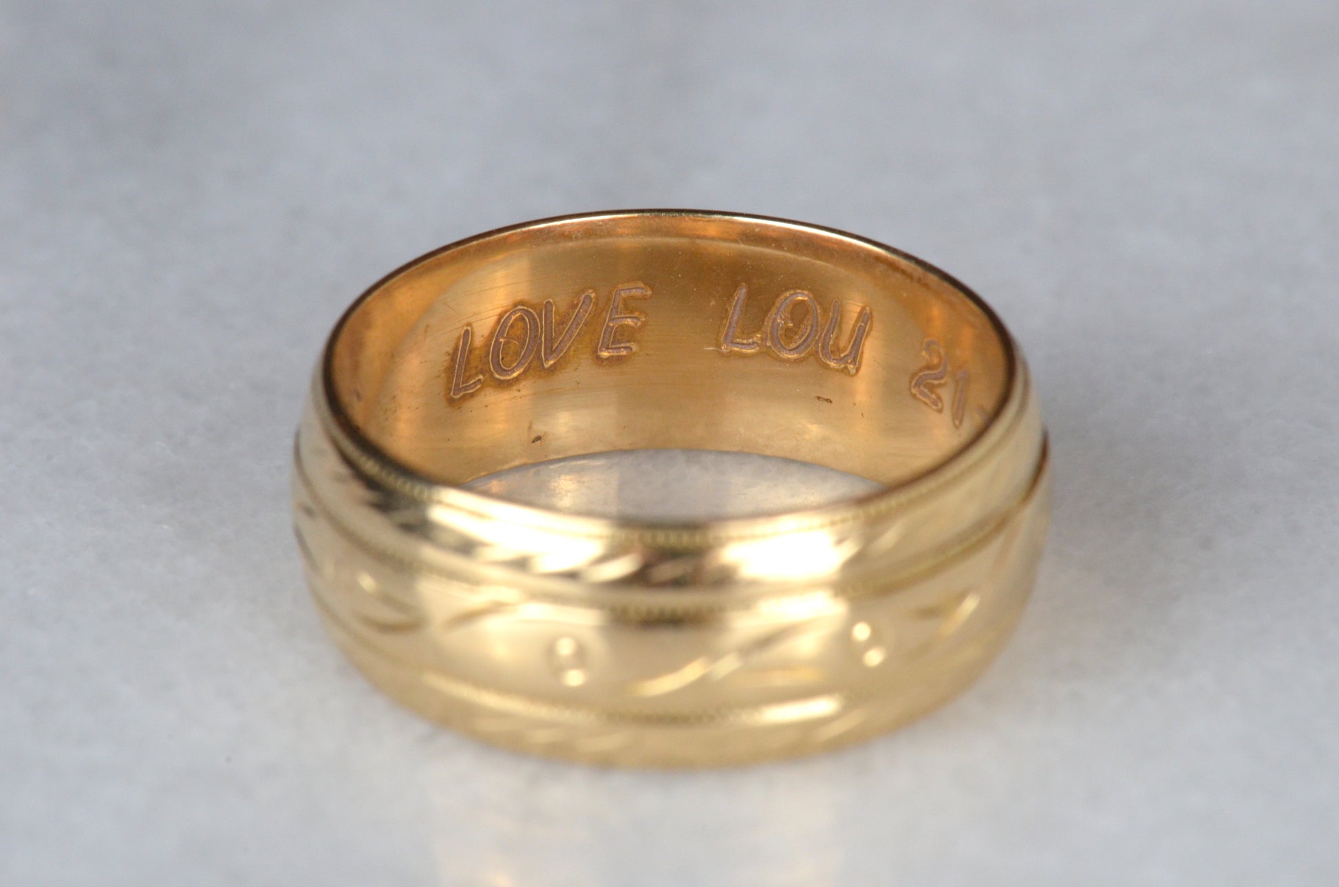 A beautiful wide hunk of a ring, with sweet and flowing engraving all around, and a perfectly concise message inside: LOVE LOU. A fantastic ring for every day wear, easy alone, in a stack, or as a playful and unique wedding band.