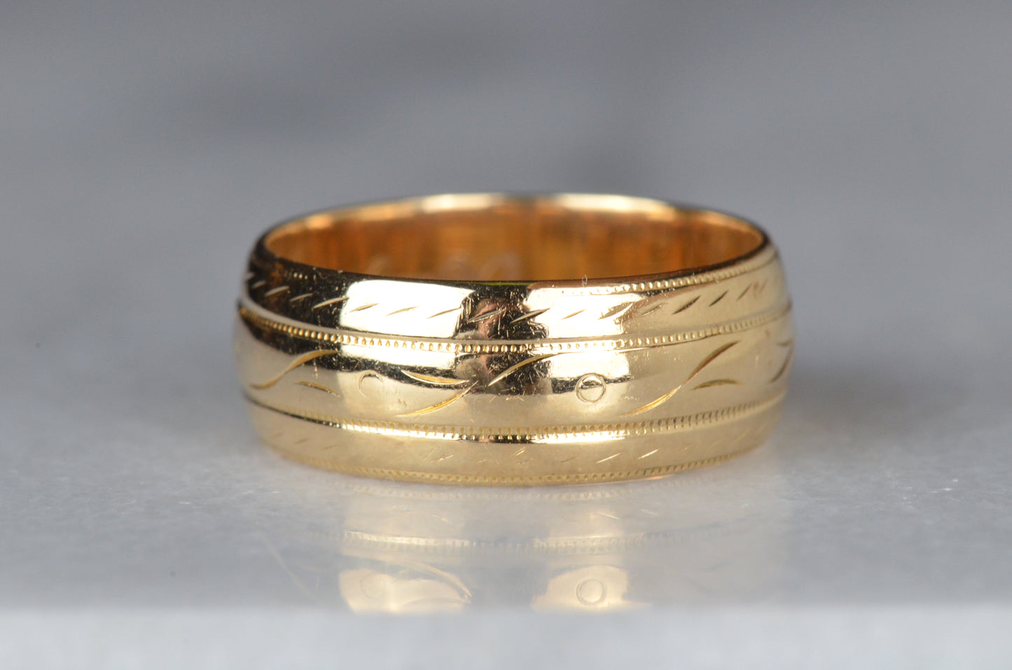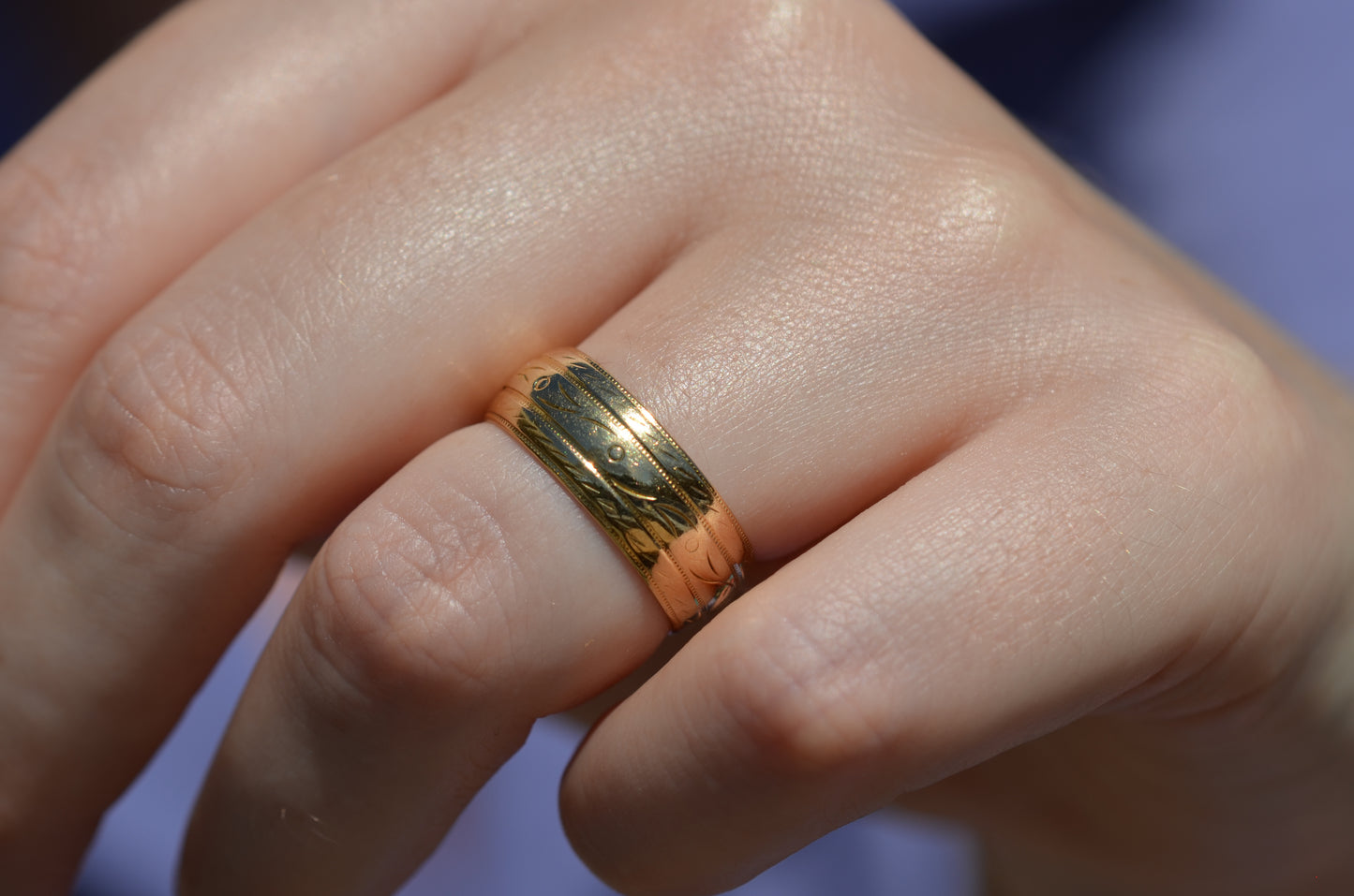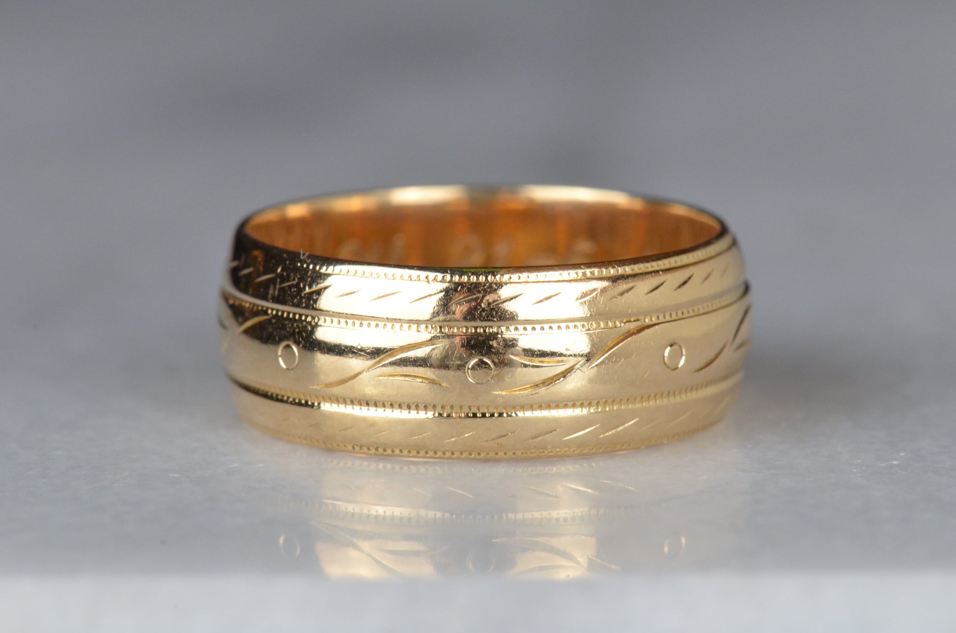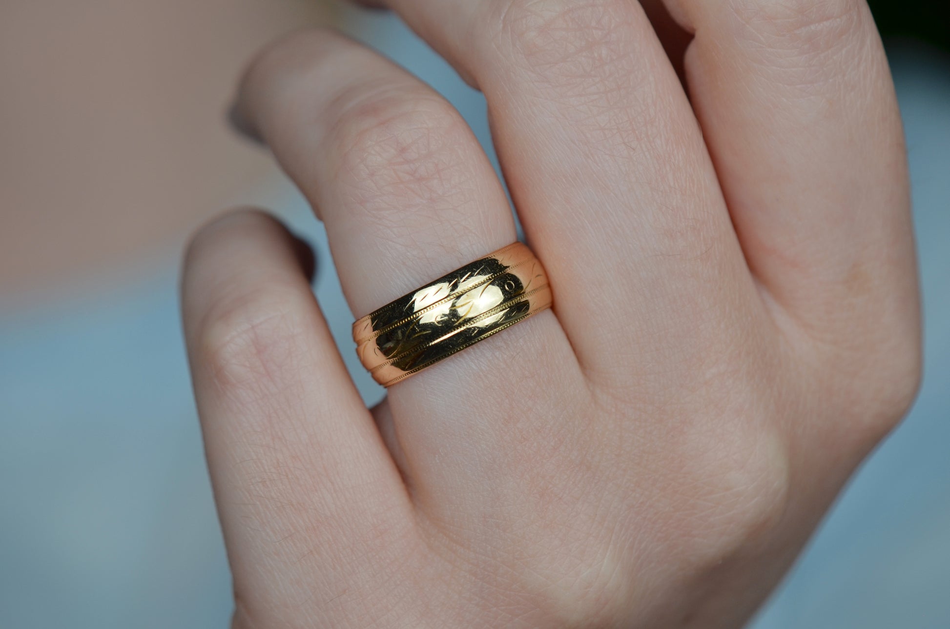 A beautiful wide hunk of a ring, with sweet and flowing engraving all around, and a perfectly concise message inside: LOVE LOU. A fantastic ring for every day wear, easy alone, in a stack, or as a playful and unique wedding band.