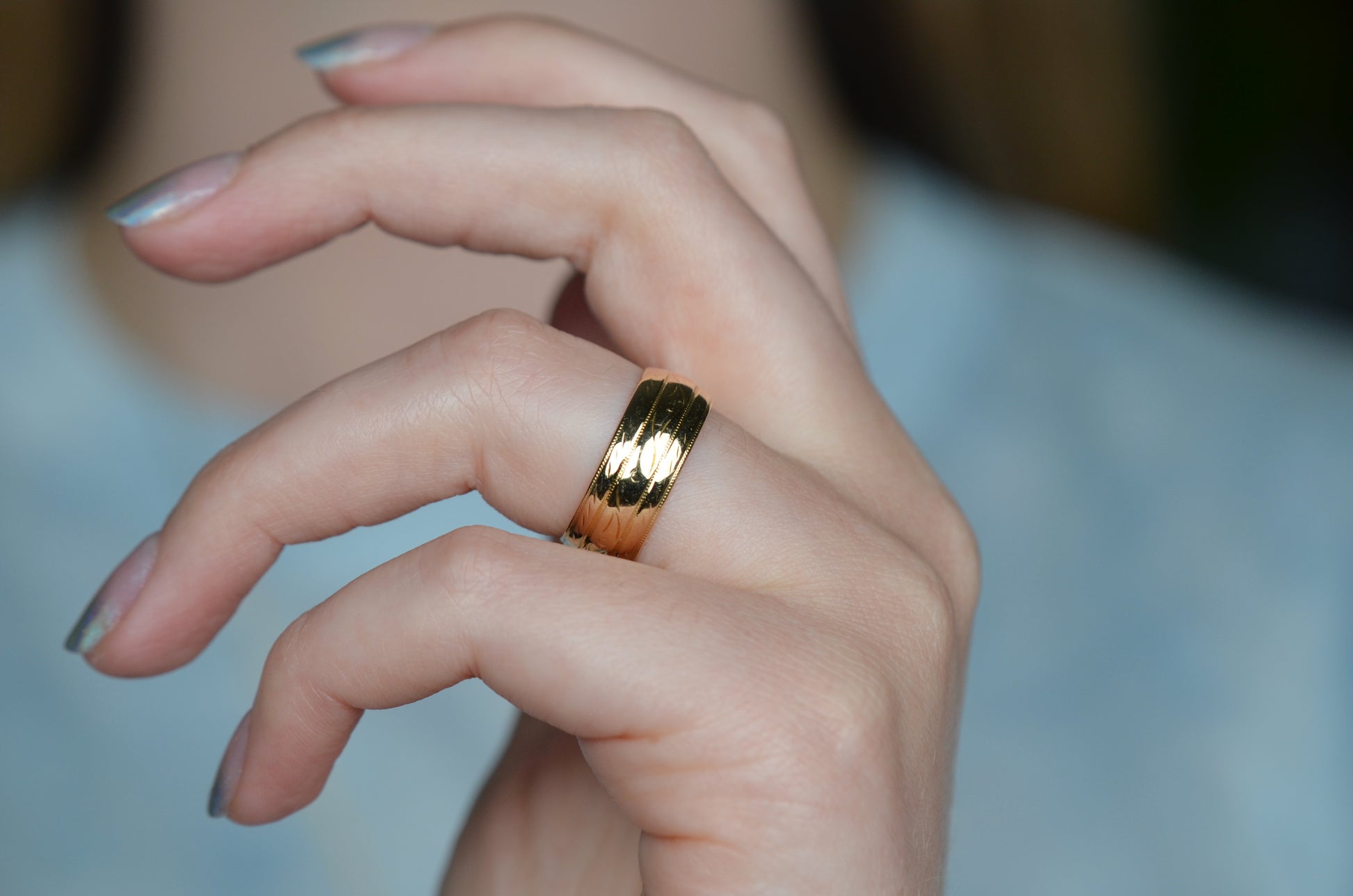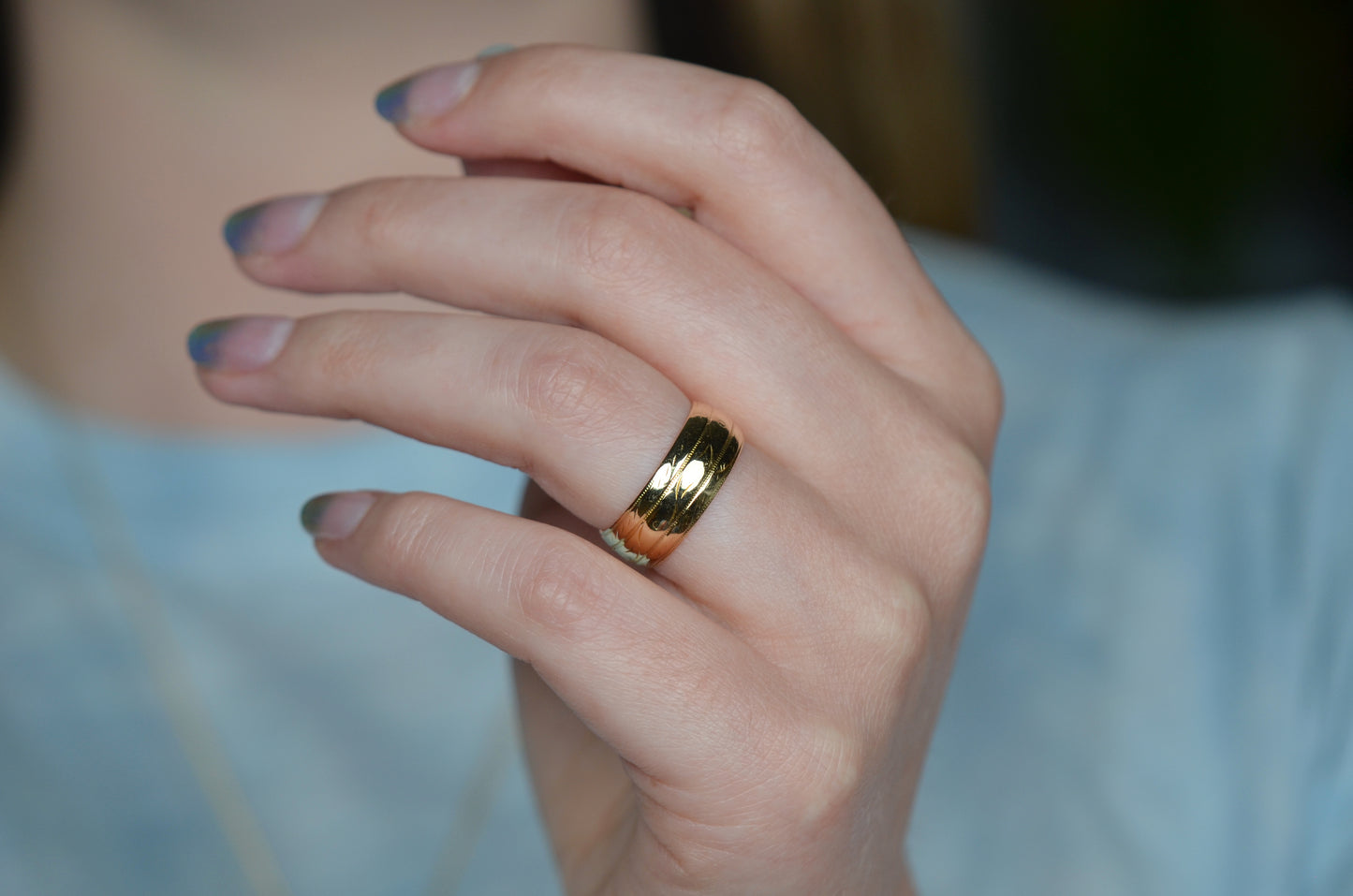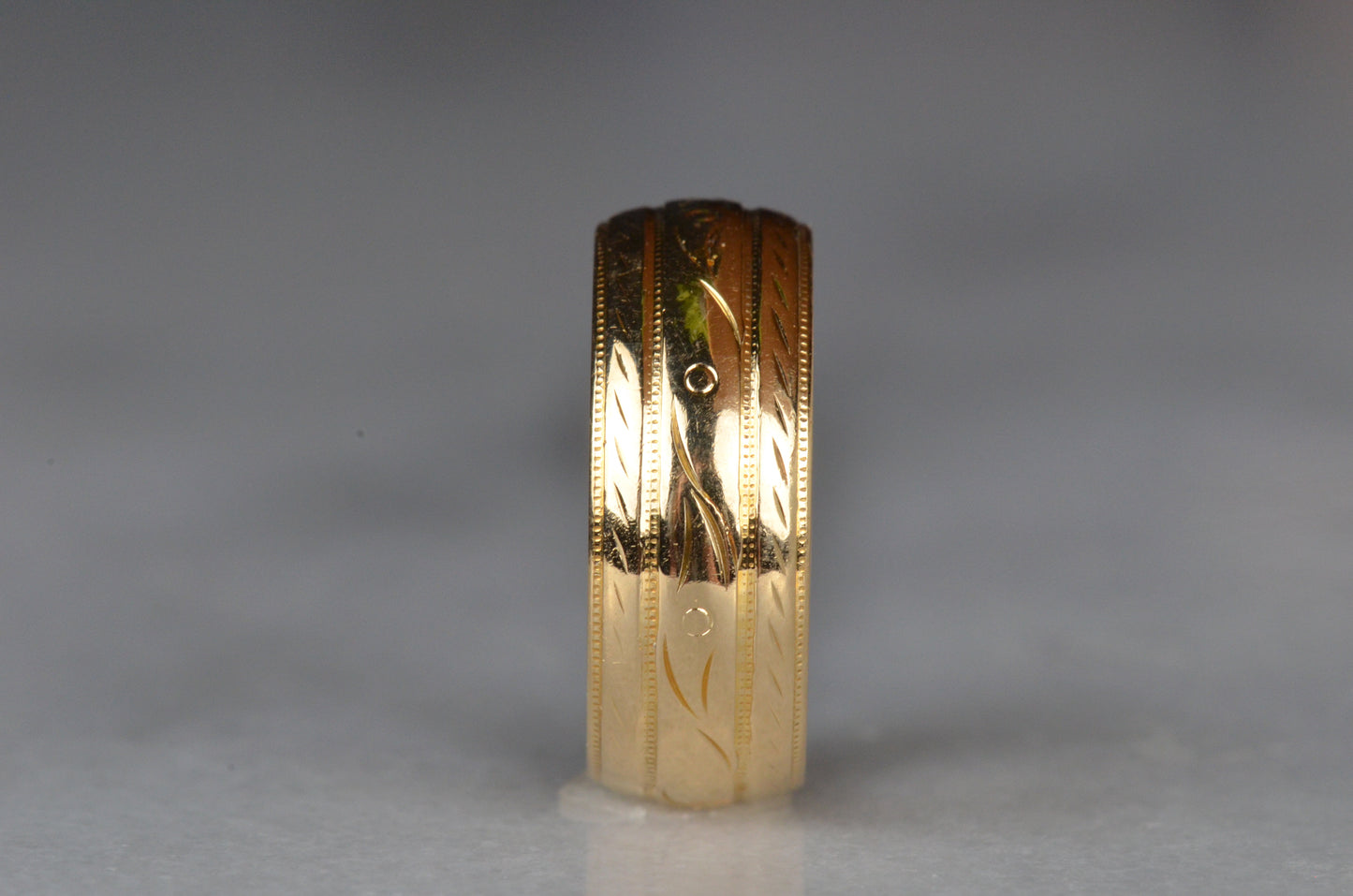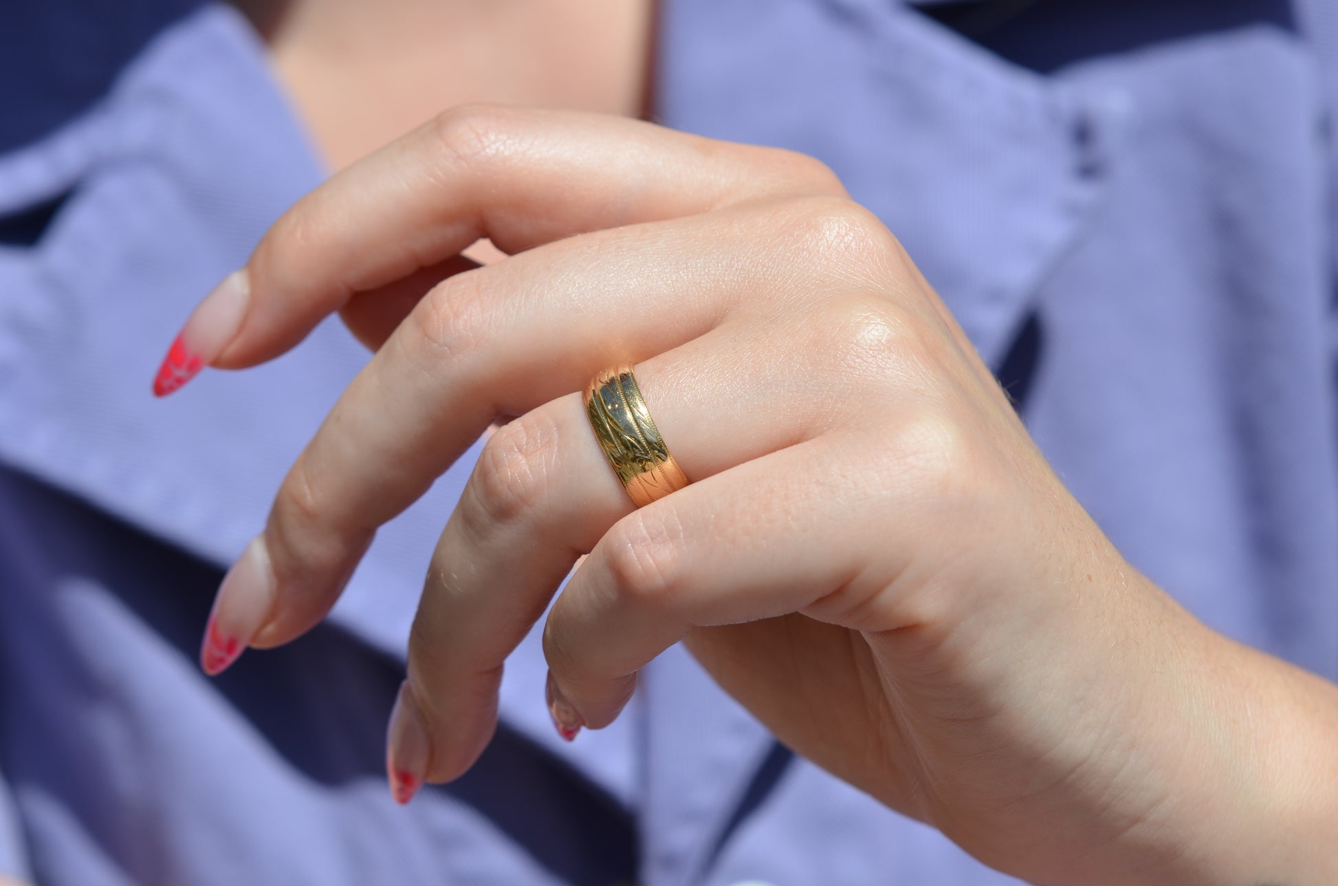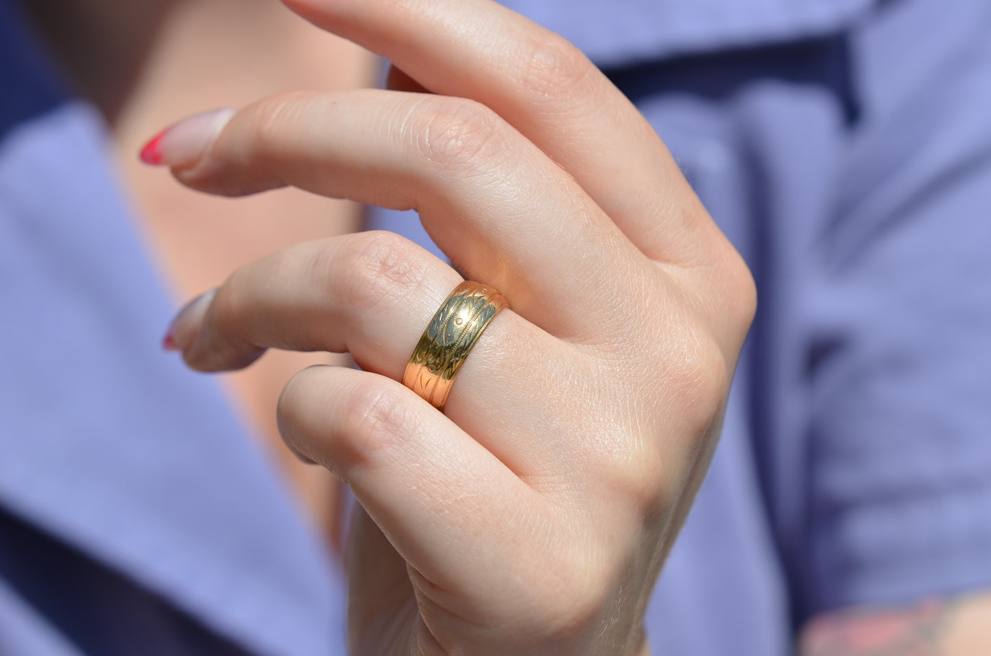 A beautiful wide hunk of a ring, with sweet and flowing engraving all around, and a perfectly concise message inside: LOVE LOU. A fantastic ring for every day wear, easy alone, in a stack, or as a playful and unique wedding band.